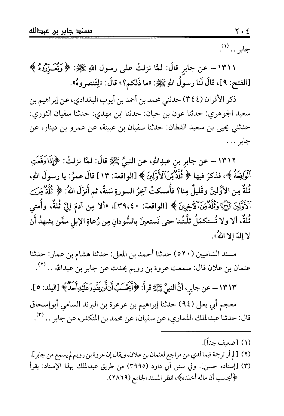 (¬2) [لم أر ترجمة فيما لدي من مراجع لعثمان بن علان، ويقال إن عروة رويم لم يسمع من جابر].