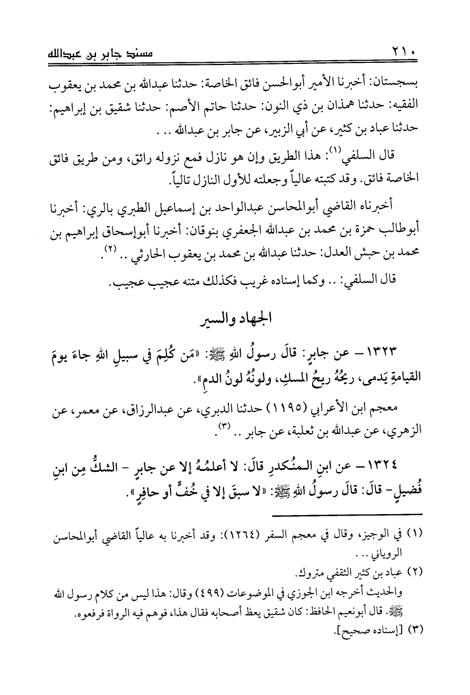 الهروي بسجستان: أخبرنا الأمير أبوالحسن فائق الخاصة: حدثنا عبدالله بن محمد بن يعقوب الفقيه: حدثنا همذان بن ذي النون: حدثنا حاتم الأصم: حدثنا شقيق بن إبراهيم: حدثنا عباد بن كثير، عن أبي الزبير، عن جابر بن عبدالله .. .
