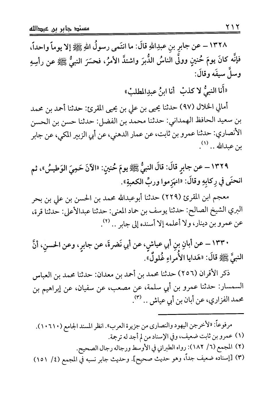 أمالي الخلال (97) حدثنا يحيى بن علي بن يحيى المقرئ: حدثنا أحمد بن محمد بن سعيد الحافظ الهمداني: حدثنا محمد بن الفضل: حدثنا حسن بن الحسن الأنصاري: حدثنا عمرو بن ثابت، عن عمار الدهني، عن أبي الزبير المكي، عن جابر بن عبدالله .. (¬1).