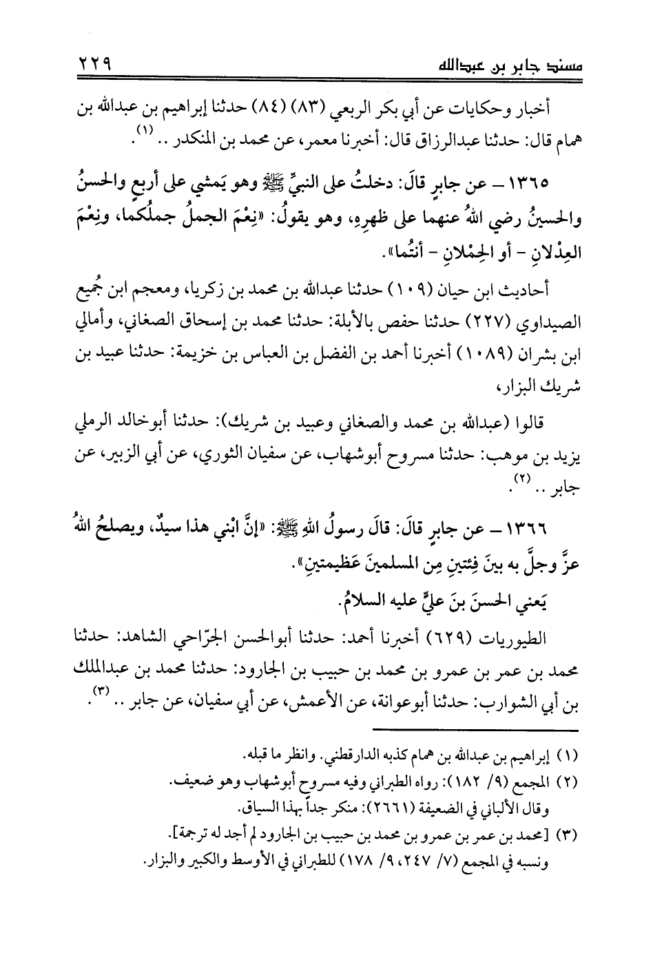 1366 - عن جابرٍ قالَ: قالَ رسولُ اللهِ صلى الله عليه وسلم: «إنَّ ابْني هذا سيدٌ، ويصلحُ اللهُ عزَّ وجلَّ به بينَ فِئتينِ مِن المسلمينَ عَظيمتينِ».