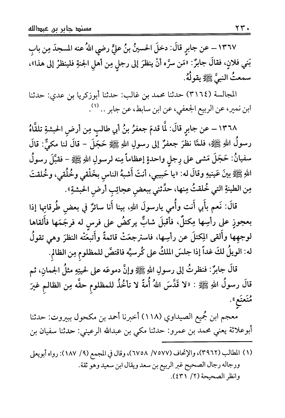 1367 - عن جابرٍ قالَ: دخلَ الحسينُ بنُ عليٍّ رضي اللهُ عنه المسجدَ مِن بابِ بَني فلانٍ، فقالَ جابرٌ: «مَن سرَّه أنْ ينظرَ إلى رجلٍ مِن أهلِ الجنةِ فلينظرْ إلى هذا»، سمعتُ النبيَّ صلى الله عليه وسلم يقولُهُ.