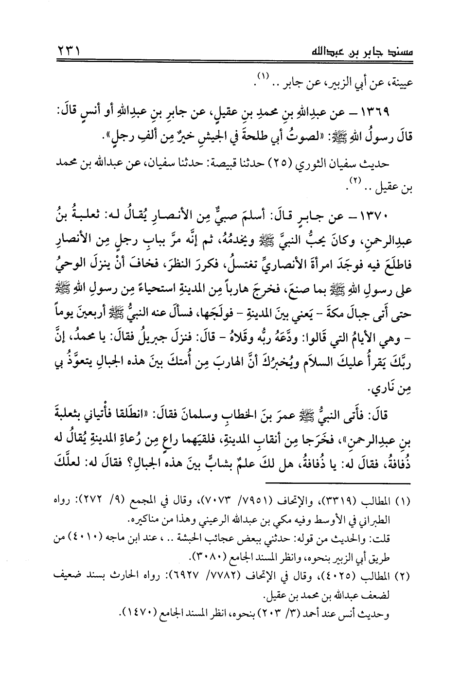 1369 - عن عبدِاللهِ بنِ محمدِ بنِ عقيلٍ، عن جابرِ بنِ عبدِاللهِ أو أنسٍ قالَ: قالَ رسولُ اللهِ صلى الله عليه وسلم: «لصوتُ أبي طلحةَ في الجيشِ خيرٌ مِن ألفِ رجلٍ».