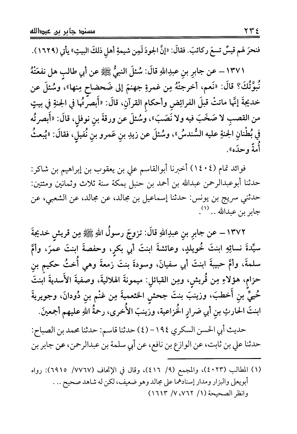 فوائد تمام (1404) أخبرنا أبوالقاسم علي بن يعقوب بن إبراهيم بن شاكر: حدثنا أبوعبدالرحمن عبدالله بن أحمد بن حنبل بمكة سنة ثلاث وثمانين ومئتين: حدثني سريج بن يونس: حدثنا إسماعيل بن مجالد، عن مجالد، عن الشعبي، عن جابر بن عبدالله .. (¬1).