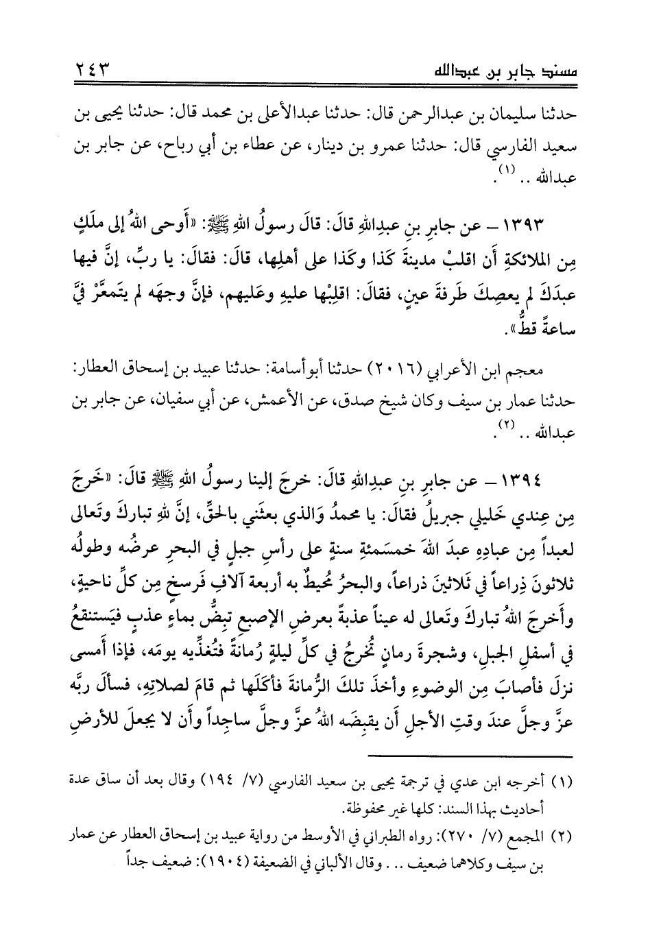 1394 - عن جابرِ بنِ عبدِاللهِ قالَ: خرجَ إلينا رسولُ اللهِ صلى الله عليه وسلم قالَ: «خَرجَ مِن عِندي خَليلي جبريلُ فقالَ: يا محمدُ وَالذي بعثَني بالحقِّ، إنَّ للهِ تباركَ وتَعالى لعبداً مِن عبادِهِ عبدَ اللهَ خمسَمئةِ سنةٍ على رأسِ جبلٍ في البحرِ عرضُه وطولُه ثلاثونَ ذِراعاً في ثَلاثينَ ذراعاً، والبحرُ مُحيطٌ به أربعةُ آلافِ فَرسخٍ مِن كلِّ ناحيةٍ، وأَخرجَ اللهُ تباركَ وتَعالى له عيناً عذبةً بعرضِ الإصبعِ تبِضُّ بماءٍ عذبٍ فيَستنقعُ في أسفلِ الجبلِ، وشجرةَ رمانٍ تُخرجُ في كلِّ ليلةٍ رُمانةً فتُغذِّيه يومَه، فإذا أَمسى نزلَ فأصابَ مِن الوضوءِ وأخذَ تلكَ الرُّمانةَ فأكَلَها ثم قامَ لصلاتِهِ، فسألَ ربَّه عزَّ وجلَّ عندَ وقتِ الأجلِ أَن يقبِضَه اللهُ عزَّ وجلَّ ساجِداً وأَن لا يجعلَ للأرضِ