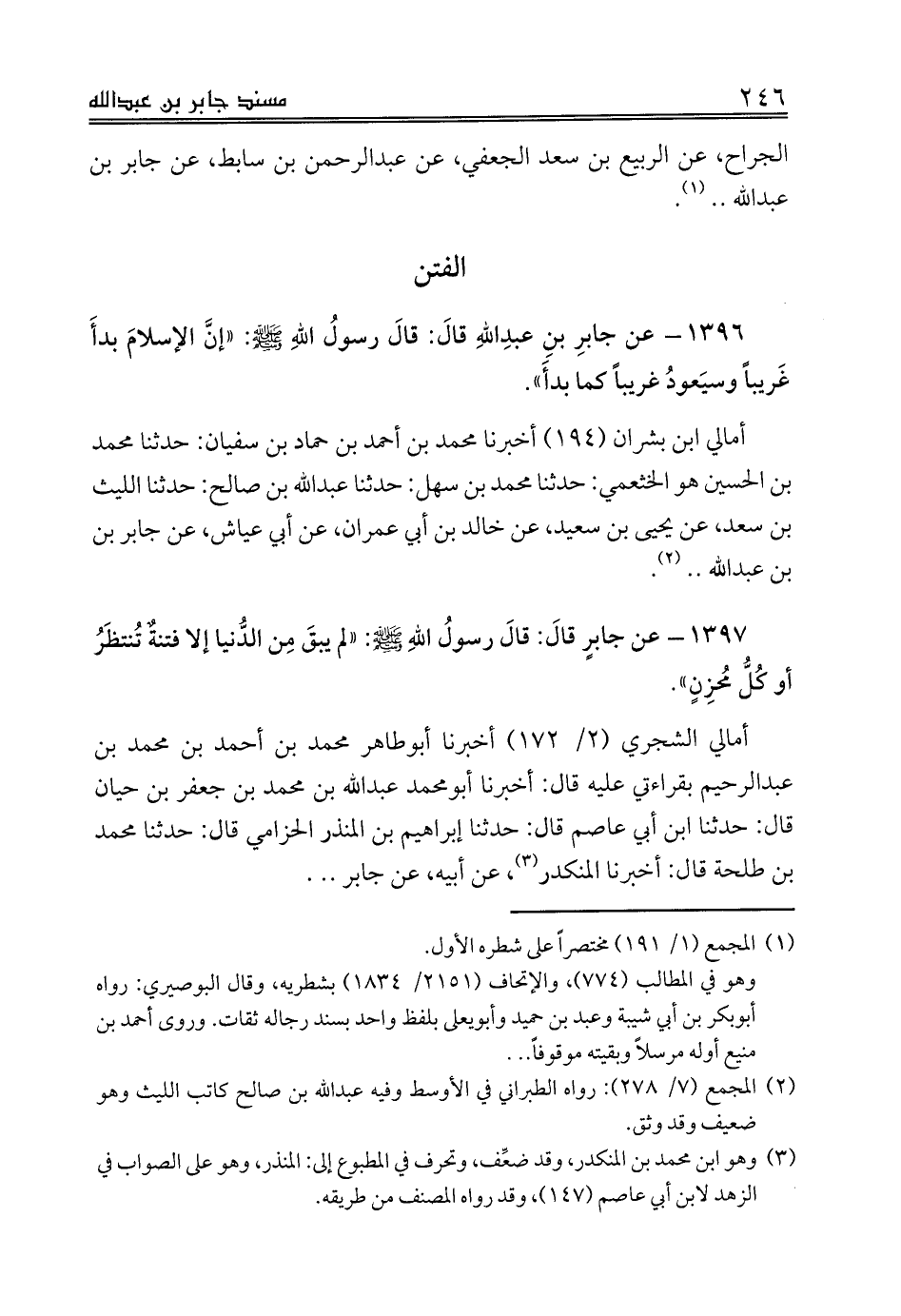 1396 - عن جابرِ بنِ عبدِاللهِ قالَ: قالَ رسولُ اللهِ صلى الله عليه وسلم: «إنَّ الإسلامَ بدأَ غَريباً وسيَعودُ غريباً كما بدأَ».