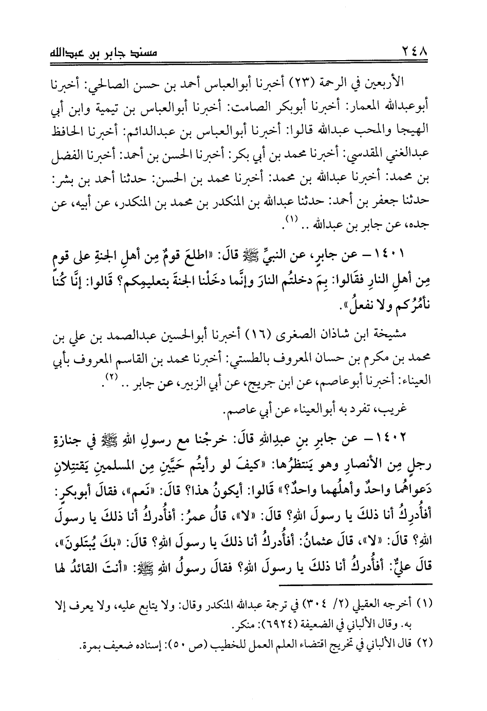 الأربعين في الرحمة (23) أخبرنا أبوالعباس أحمد بن حسن الصالحي: أخبرنا أبوعبدالله المعمار: أخبرنا أبوبكر الصامت: أخبرنا أبوالعباس بن تيمية وابن أبي الهيجا والمحب عبدالله قالوا: أخبرنا أبوالعباس بن عبدالدائم: أخبرنا الحافظ عبدالغني المقدسي: أخبرنا محمد بن أبي بكر: أخبرنا الحسن بن أحمد: أخبرنا الفضل بن محمد: أخبرنا عبدالله بن محمد: أخبرنا محمد بن الحسن: حدثنا أحمد بن بشر: حدثنا جعفر بن أحمد: حدثنا عبدالله بن المنكدر بن محمد بن المنكدر، عن أبيه، عن جده، عن جابر بن عبدالله .. (¬1).