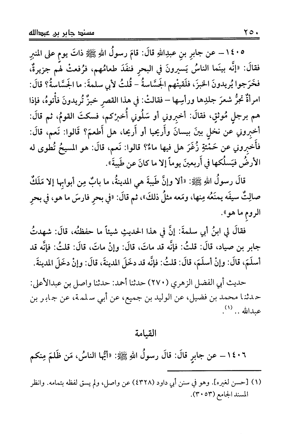 1405 - عن جابرِ بنِ عبدِاللهِ قالَ: قامَ رسولُ اللهِ صلى الله عليه وسلم ذاتَ يومٍ على المنبرِ فقالَ: «إنَّه بينَما الناسُ يَسيرونَ في البحرِ فنفَدَ طعامُهم، فرُفعتْ لهم جزيرةٌ، فخَرَجوا يُريدونَ الخبزَ، فلَقيتْهم الجَسَّاسةُ - قُلتُ لأبي سلمةَ: ما الجَسَّاسةُ؟ قالَ: امرأةٌ تجرُّ شعرَ جلدِها ورأسِها – فقالتْ: في هذا القصرِ خبزٌ تُريدونَ فأْتوهُ، فإذا هم برجلٍ مُوثقٍ، فقالَ: أخبِروني أو سَلُوني أُخبرْكم، فسكتَ القومُ، ثم قالَ: أخبِروني عن نخلٍ بينَ بيسانَ وأَريحيا أو أَريحا، هل أَطعمَ؟ قَالوا: نَعم، قالَ: فأَخبِروني عن حَمْئةِ زُغَرَ هل فيها ماءٌ؟ قالوا: نَعم، قالَ: هو المسيحُ تُطوى له الأرضُ فيَسلُكها في أَربعينَ يوماً إلا ما كانَ عن طَيبةَ».