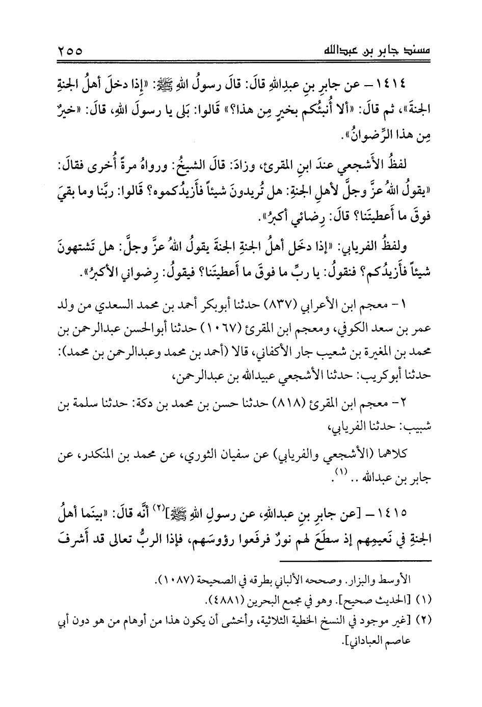1415 - [عن جابرِ بنِ عبداللهِ، عن رسولِ اللهِ صلى الله عليه وسلم] (¬2) أنَّه قالَ: «بينَما أهلُ الجنةِ في نَعيمِهم إذ سطَعَ لهم نورٌ فرفَعوا رؤوسَهم، فإذا الربُّ تعالى قد أَشرفَ