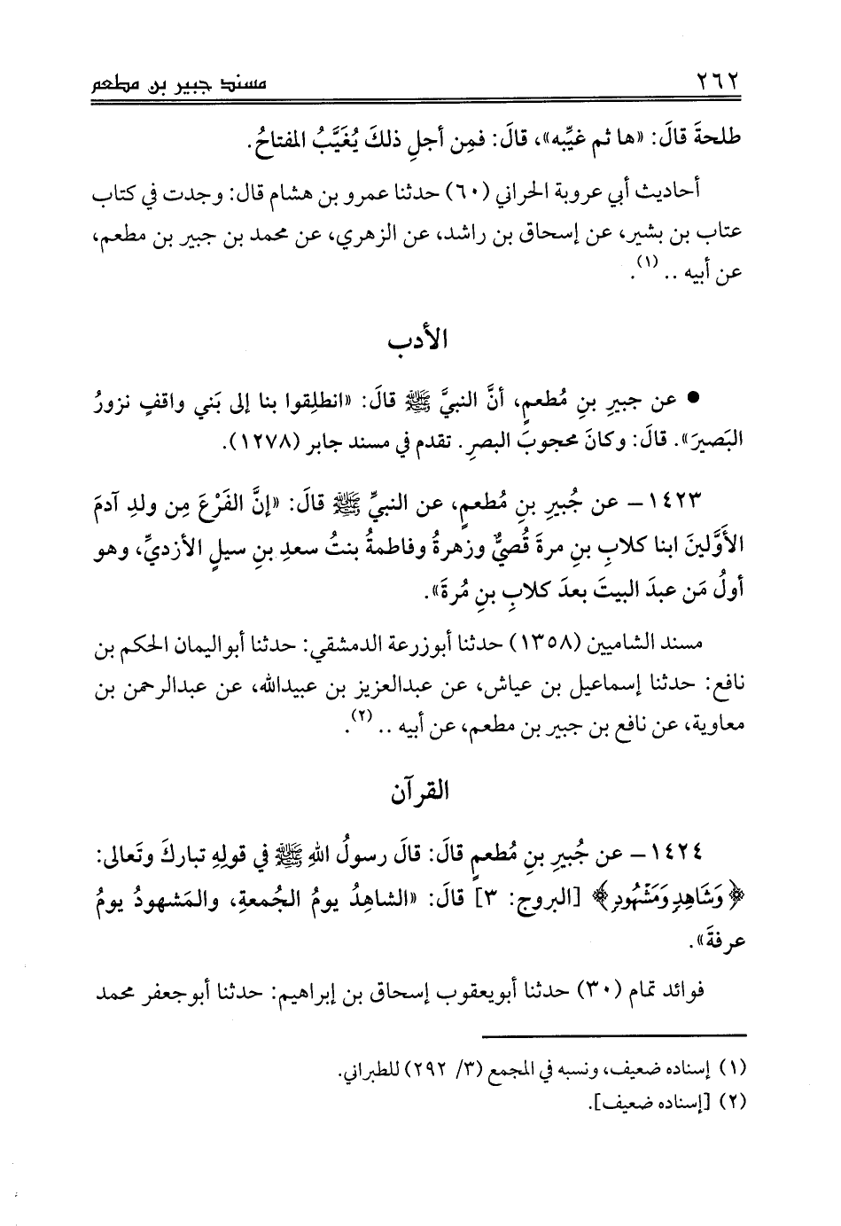 1424 - عن جُبيرِ بنِ مُطعمٍ قالَ: قالَ رسولُ اللهِ صلى الله عليه وسلم في قولِهِ تباركَ وتَعالى: {وَشَاهِدٍ وَمَشْهُودٍ} [البروج: 3] قالَ: «الشاهِدُ يومُ الجُمعةِ، والمَشهودُ يومُ عرفةَ».