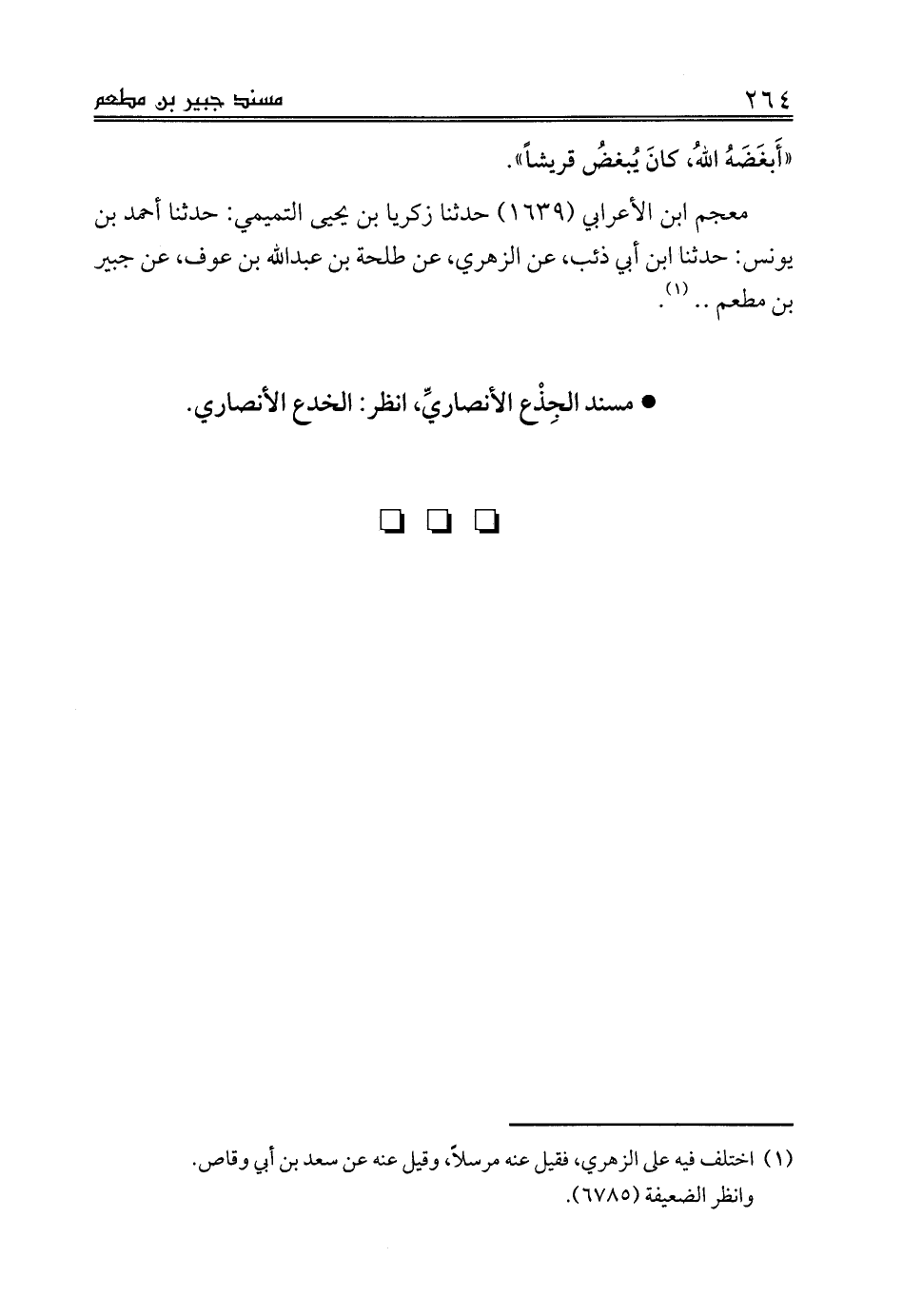 معجم ابن الأعرابي (1639) حدثنا زكريا بن يحيى التميمي: حدثنا أحمد بن يونس: حدثنا ابن أبي ذئب، عن الزهري، عن طلحة بن عبدالله بن عوف، عن جبير بن مطعم .. (¬1).