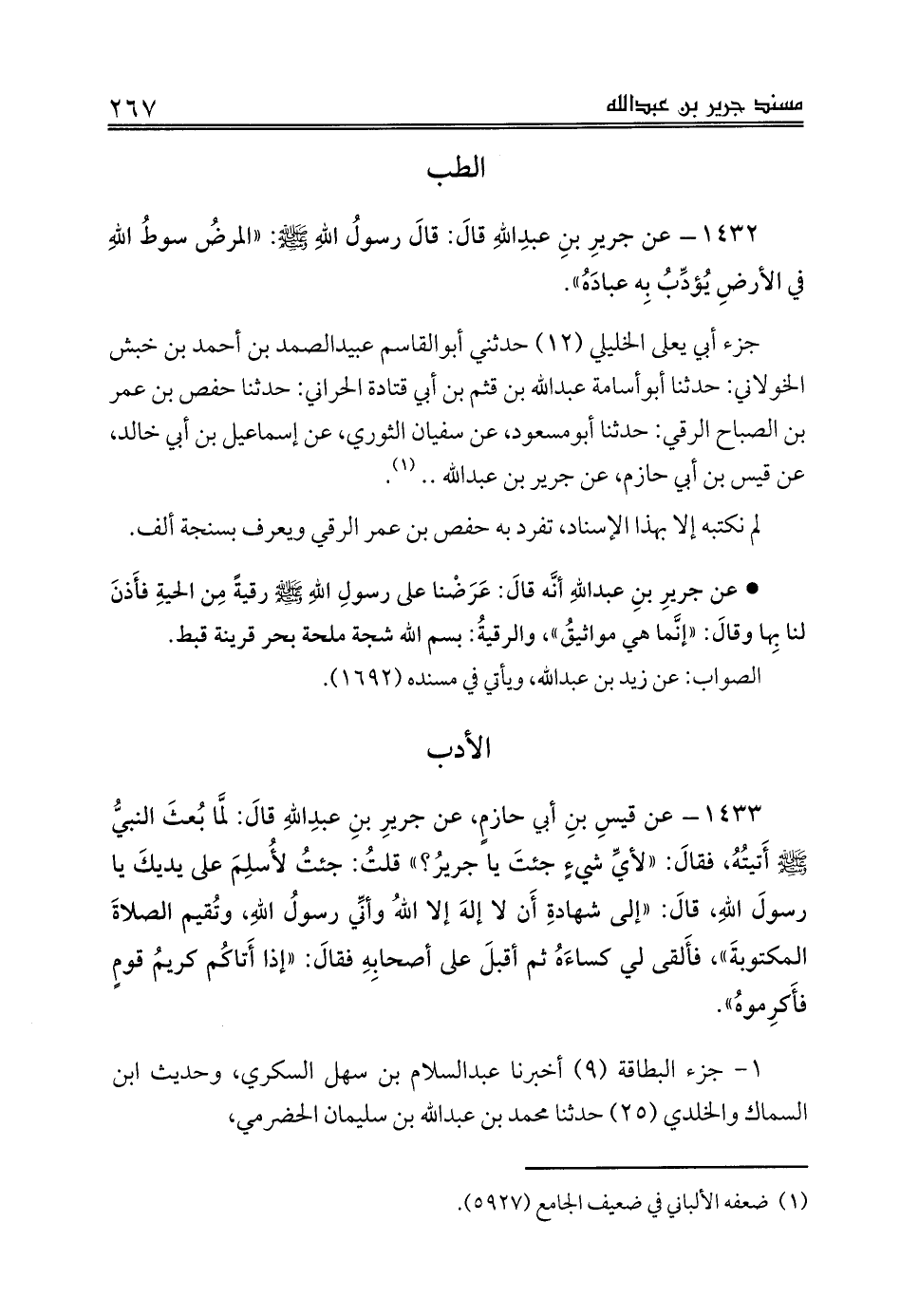 جزء أبي يعلى الخليلي (12) حدثني أبوالقاسم عبيد الصمد بن أحمد بن خبش الخولاني: حدثنا أبوأسامة عبدالله بن قثم بن أبي قتادة الحراني: حدثنا حفص بن عمر بن الصباح الرقي: حدثنا أبومسعود، عن سفيان الثوري، عن إسماعيل بن أبي خالد، عن قيس بن أبي حازم، عن جرير بن عبدالله .. (¬1).