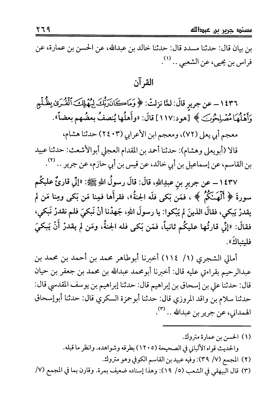 1437 - عن جريرِ بنِ عبدِاللهِ، قالَ: قالَ رسولُ اللهِ صلى الله عليه وسلم: «إنِّي قارئٌ عليكُم سورةَ {أَلْهَاكُمُ}، فمَن بَكى فلَه الجنةُ»، فقرأَها فمِنا مَن بَكى ومِنا مَن لم يقدرْ يَبكي، فقالَ الذينَ لم يَبْكوا: يا رسولَ اللهِ، جَهدْنا أنْ نَبكيَ فلم نقدرْ نَبكي، فقالَ: «إنِّي قارئُها عليكُم ثانياً، فمَن بَكى فله الجنةُ، ومَن لم يقدرْ أَنْ يَبكيَ فليتباكَ».