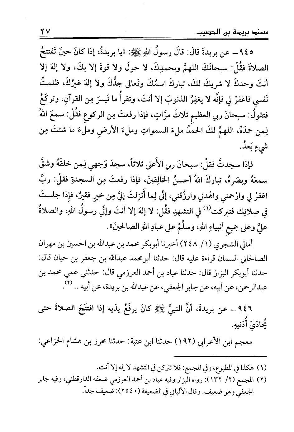 945 - عن بريدةَ قالَ: قالَ رسولُ اللهِ صلى الله عليه وسلم: «يا بريدةُ، إذا كانَ حينَ تَفتتحُ الصلاةَ فقُلْ: سبحانَكَ اللهمَّ وبحمدِكَ، لا حولَ ولا قوةَ إلا بكَ، ولا إلهَ إلا أنتَ وحدكَ لا شريكَ لكَ، تباركَ اسمُكَ وتَعالى جدُّكَ ولا إلهَ غيرُكَ، ظلمتُ نَفسي فاغفرْ لي فإنَّه لا يغفِرُ الذنوبَ إلا أنتَ، وتقرأُ ما تَيسرَ مِن القرآنِ، وتركَعُ فتقولُ: سبحانَ ربي العظيمِ ثلاثَ مرَّاتٍ، فإذا رفعتَ مِن الركوعِ فقُلْ: سمعَ اللهُ لِمن حمدَهُ، اللهمَّ لكَ الحمدُ ملءَ السمواتِ وملءَ الأرضِ وملءَ ما شئتَ مِن شيءٍ بَعدُ،