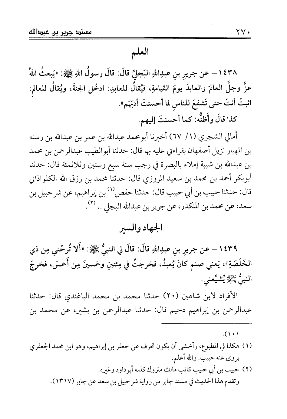 1438 - عن جريرِ بنِ عبدِاللهِ البَجليِّ قالَ: قالَ رسولُ اللهِ صلى الله عليه وسلم: «يَبعثُ اللهُ عزَّ وجلَّ العالمَ والعابدَ يومَ القيامةِ، فيُقالُ للعابدِ: ادخُل الجنةَ، ويُقالُ للعالمِ: اثبتْ أنتَ حتى تَشفعَ للناسِ لما أحسنتَ أدبَهَم».