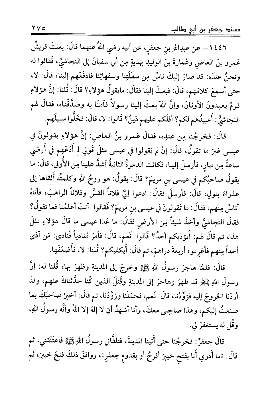 1446 - عن عبدِاللهِ بنِ جعفرٍ، عن أبيه رضي اللهُ عنهما قالَ: بعثتْ قريشٌ عَمرو بنَ العاصِ وعُمارةَ بنَ الوليدِ بهديةٍ مِن أبي سفيانَ إلى النجاشيِّ، فَقالوا له ونحنُ عندَه: قد صارَ إليكَ ناسٌ مِن سفَلَتِنا وسفهائِنا فادفَعْهم إلينا، قالَ: لا، حتى أسمعَ كلامَهم، قالَ: فبعثَ إلينا فقالَ: مايقولُ هؤلاءِ؟ قالَ: قُلنا: إنَّ هؤلاءِ قومٌ يعبدونَ الأوثانَ، وإنَّ اللهَ بعثَ إلينا رسولاً فآمنّا به وصدَّقْناه، فقالَ لهم النجاشيُّ: أَعبيدُهم لكم؟ أفلَكم عليهم دَينٌ؟ قَالوا: لا، قالَ: فخَلُّوا سبيلَهم.