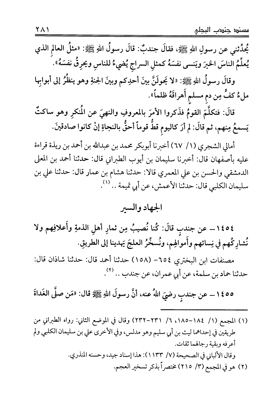 1454 - عن جندبٍ قالَ: كُنا نُصيبُ مِن ثمارِ أهلِ الذمةِ وأَعلافِهم ولا نُشارِكُهم في نِسائهم وأَموالِهم، ونُسخِّرُ العلجَ يَهدينا إلى الطريقِ.