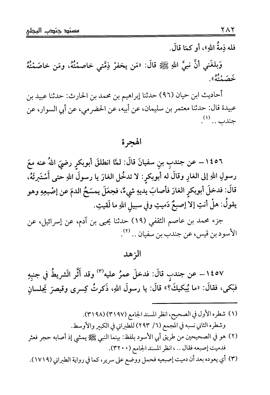 1456 - عن جندبِ بنِ سفيانَ قالَ: لمَّا انطلقَ أبوبكرٍ رضيَ اللهُ عنه معَ رسولِ اللهِ إلى الغارِ وقالَ له أبوبكرٍ: لا تدخُل الغارَ يا رسولَ اللهِ حتى أَسْتَبرئَهُ، قالَ: فدخلَ أبوبكرٍ الغارَ فأصابَ يديهِ شيءٌ، فجعَلَ يمسَحُ الدمَ عن إصْبعِهِ وهو يقولُ: هلْ أنتِ إلا إصبعٌ دَميتِ وفي سبيلِ اللهِ مالَقيتِ.