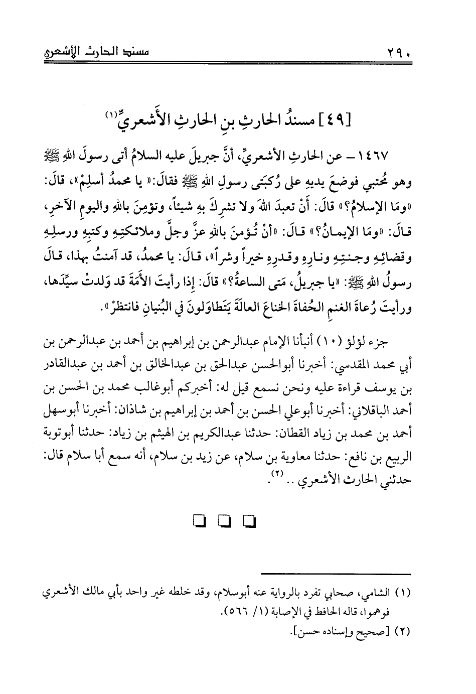 1467 - عن الحارثِ الأشعريِّ، أنَّ جبريلَ عليه السلامُ أتى رسولَ اللهِ صلى الله عليه وسلم وهو مُحتبي فوضعَ يديهِ على رُكبَتى رسولِ اللهِ صلى الله عليه وسلم فقالَ: «يا محمدُ أسلِمْ»، قالَ: «ومَا الإسلامُ؟» قالَ: أَنْ تعبدَ اللهَ ولا تشرِكَ بهِ شيئاً، وتؤمِنَ باللهِ واليومِ الآخرِ، قالَ: «ومَا الإيمانُ؟» قالَ: «أنْ تُؤمنَ باللهِ عزَّ وجلَّ وملائكتِهِ وكتبِهِ ورسلِهِ وقضائِهِ وجنتِهِ ونارِهِ وقدرِهِ خيراً وشراً»، قالَ: يا محمدُ، قد آمنتُ بهذا، قالَ رسولُ اللهِ صلى الله عليه وسلم: «يا جبريلُ، مَتى الساعةُ؟» قالَ: إِذا رأيتَ الأَمَةَ قد وَلدتْ سيِّدَها، ورأيتَ رُعاةَ الغنمِ الحُفاةَ الخناعَ العالَةَ يَتَطاوَلونَ في البُنيانِ فانتظرْ».