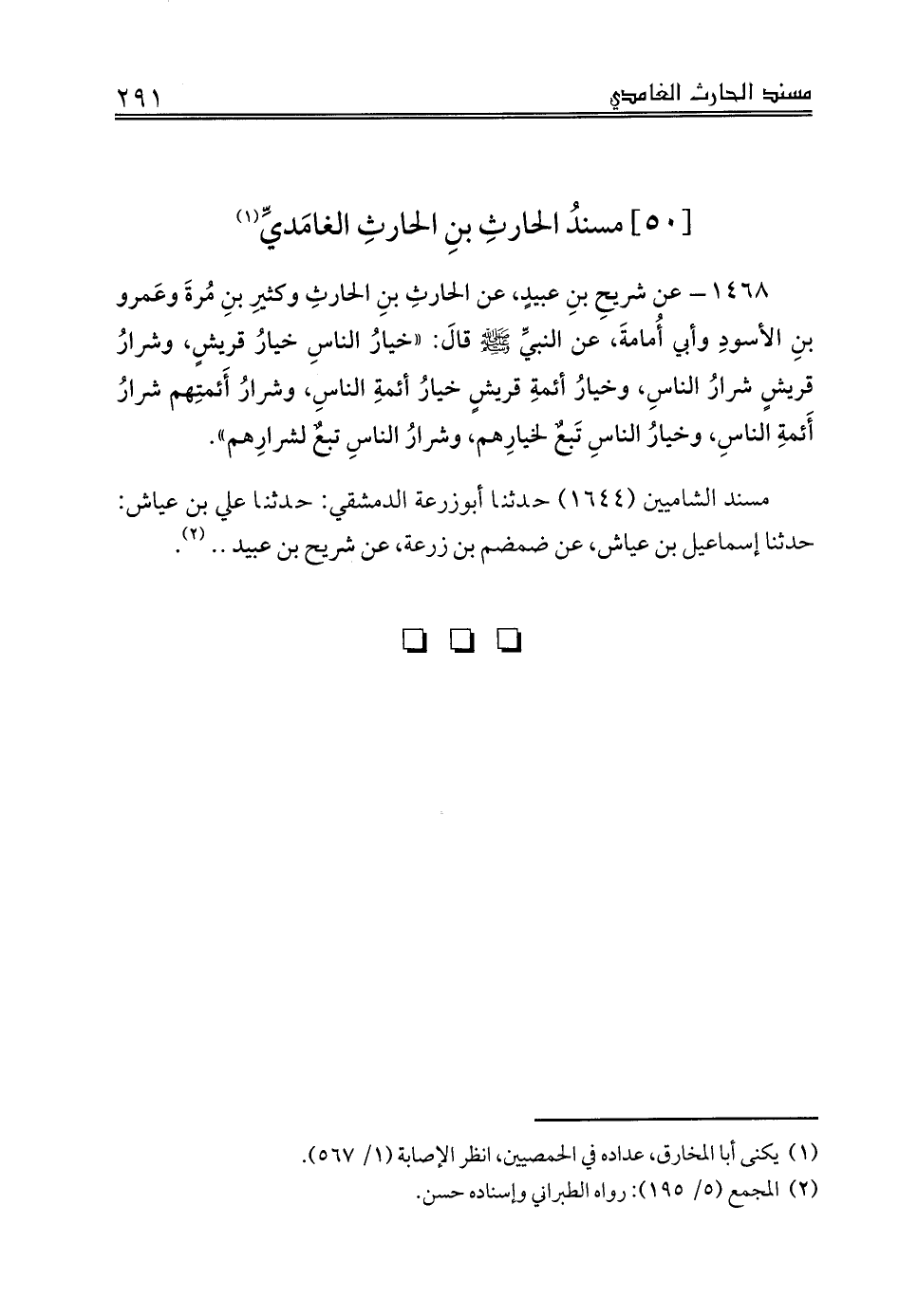 1468 - عن شريحِ بنِ عبيدٍ، عن الحارثِ بنِ الحارثِ وكثيرِ بنِ مُرةَ وعَمرو بنِ الأسودِ وأبي أُمامةَ، عن النبيِّ صلى الله عليه وسلم قالَ: «خيارُ الناسِ خيارُ قريشٍ، وشرارُ قريشٍ شرارُ الناسِ، وخيارُ أئمةِ قريشٍ خيارُ أئمةِ الناسِ، وشرارُ أَئمتِهم شرارُ أَئمةِ الناسِ، وخيارُ الناسِ تَبعٌ لخيارِهم، وشرارُ الناسِ تبعٌ لشرارِهم».