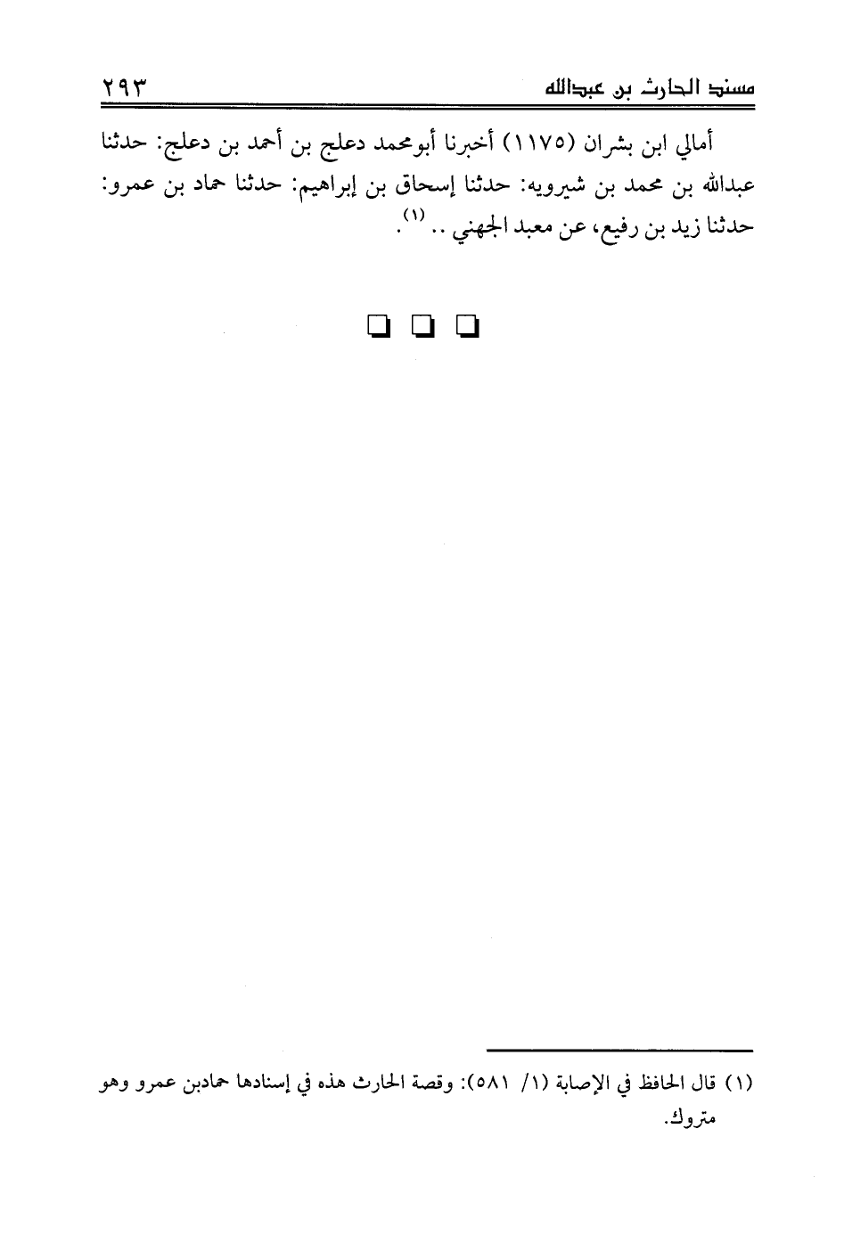 أمالي ابن بشران (1175) أخبرنا أبومحمد دعلج بن أحمد بن دعلج: حدثنا عبدالله بن محمد بن شيرويه: حدثنا إسحاق بن إبراهيم: حدثنا حماد بن عمرو: حدثنا زيد بن رفيع، عن معبد الجهني .. (¬1).