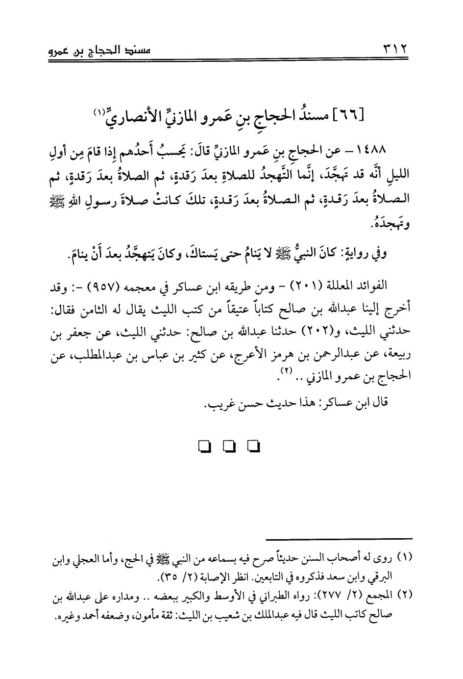 1488 - عن الحجاجِ بنِ عَمرو المازنيِّ قالَ: يَحسبُ أَحدُهم إِذا قامَ مِن أولِ الليلِ أنَّه قد تَهجَّدَ، إنَّما التَّهجدُ للصلاةِ بعدَ رَقدةٍ، ثم الصلاةُ بعدَ رَقدةٍ، ثم الصلاةُ بعدَ رَقدةٍ، ثم الصلاةُ بعدَ رَقدةٍ، تلكَ كانتْ صلاةَ رسولِ اللهِ صلى الله عليه وسلم وتَهجدَهُ.
