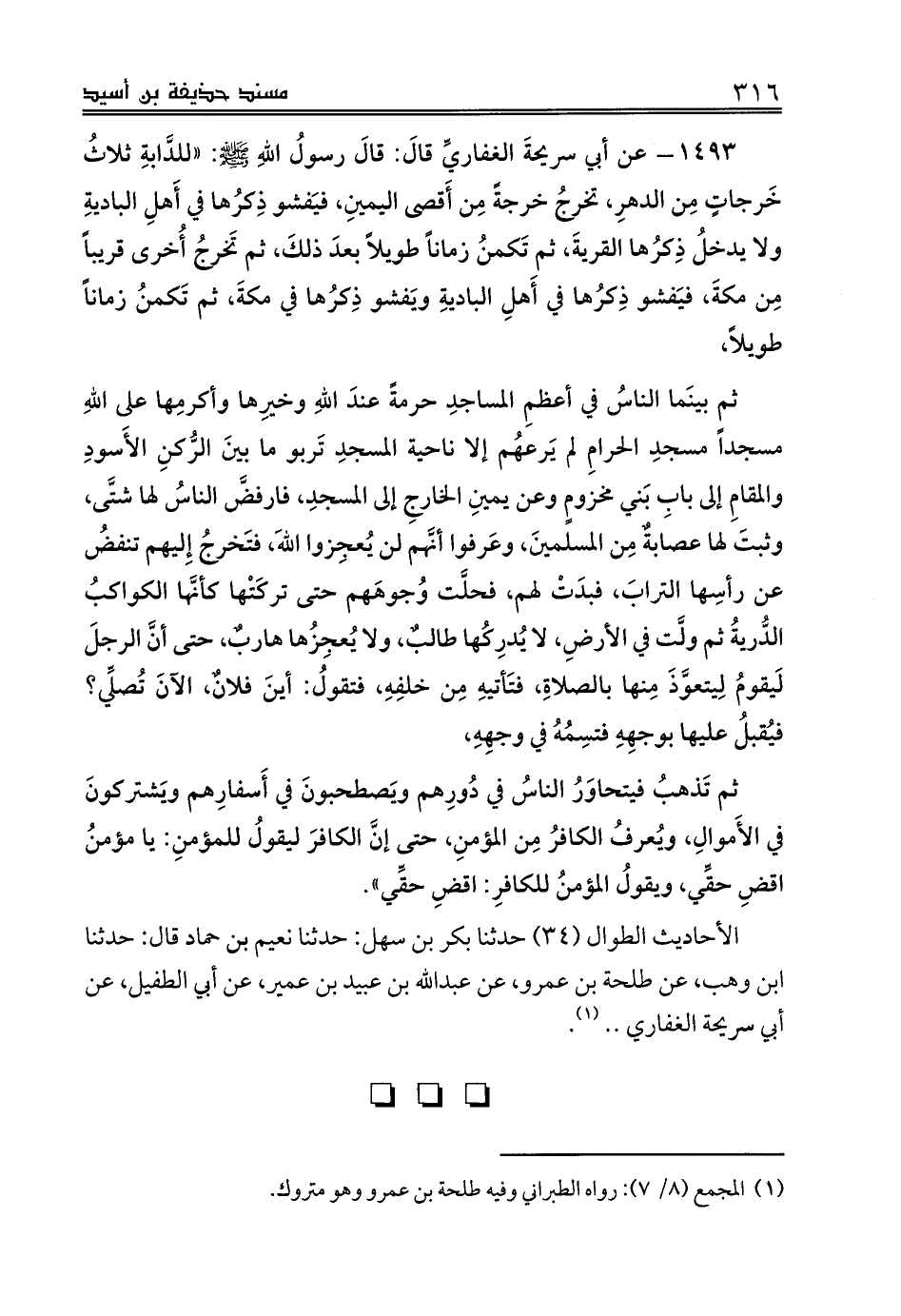 1493 - عن أبي سريحةَ الغفاريِّ قالَ: قالَ رسولُ اللهِ صلى الله عليه وسلم: «للدَّابةِ ثلاثُ خَرجاتٍ مِن الدهرِ، تخرجُ خرجةً مِن أَقصى اليمينِ، فيَفشو ذِكرُها في أَهلِ الباديةِ ولا يدخلُ ذِكرُها القريةَ، ثم تَكمنُ زماناً طويلاً بعدَ ذلكَ، ثم تَخرجُ أُخرى قريباً مِن مكةَ، فيَفشو ذِكرُها في أَهلِ الباديةِ ويَفشو ذِكرُها في مكةَ، ثم تَكمنُ زماناً طويلاً،