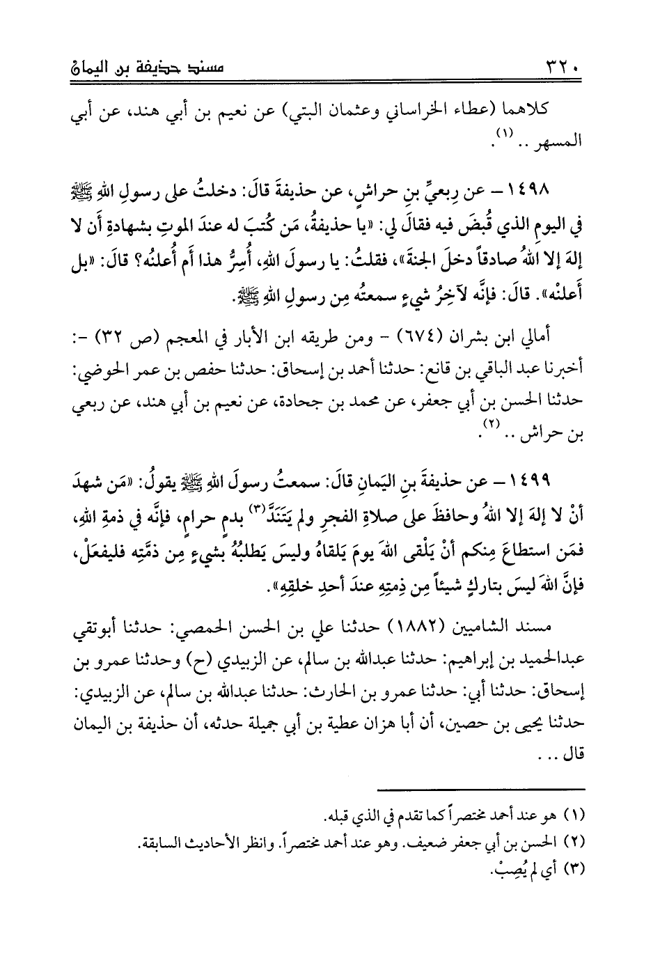 1499 - عن حذيفةَ بنِ اليَمانِ قالَ: سمعتُ رسولَ اللهِ صلى الله عليه وسلم يقولُ: «مَن شهدَ أنْ لا إلهَ إلا اللهُ وحافظَ على صلاةِ الفجرِ ولم يَتَنَدَّ (¬3) بدمٍ حرامٍ، فإنَّه في ذمةِ اللهِ، فمَن استطاعَ مِنكم أنْ يَلْقى اللهَ يومَ يَلقاهُ وليسَ يَطلبُهُ بشيءٍ مِن ذمَّتِه فليفعَلْ، فإنَّ اللهَ ليسَ بتاركٍ شيئاً مِن ذِمتِهِ عندَ أحدِ خلقِهِ».