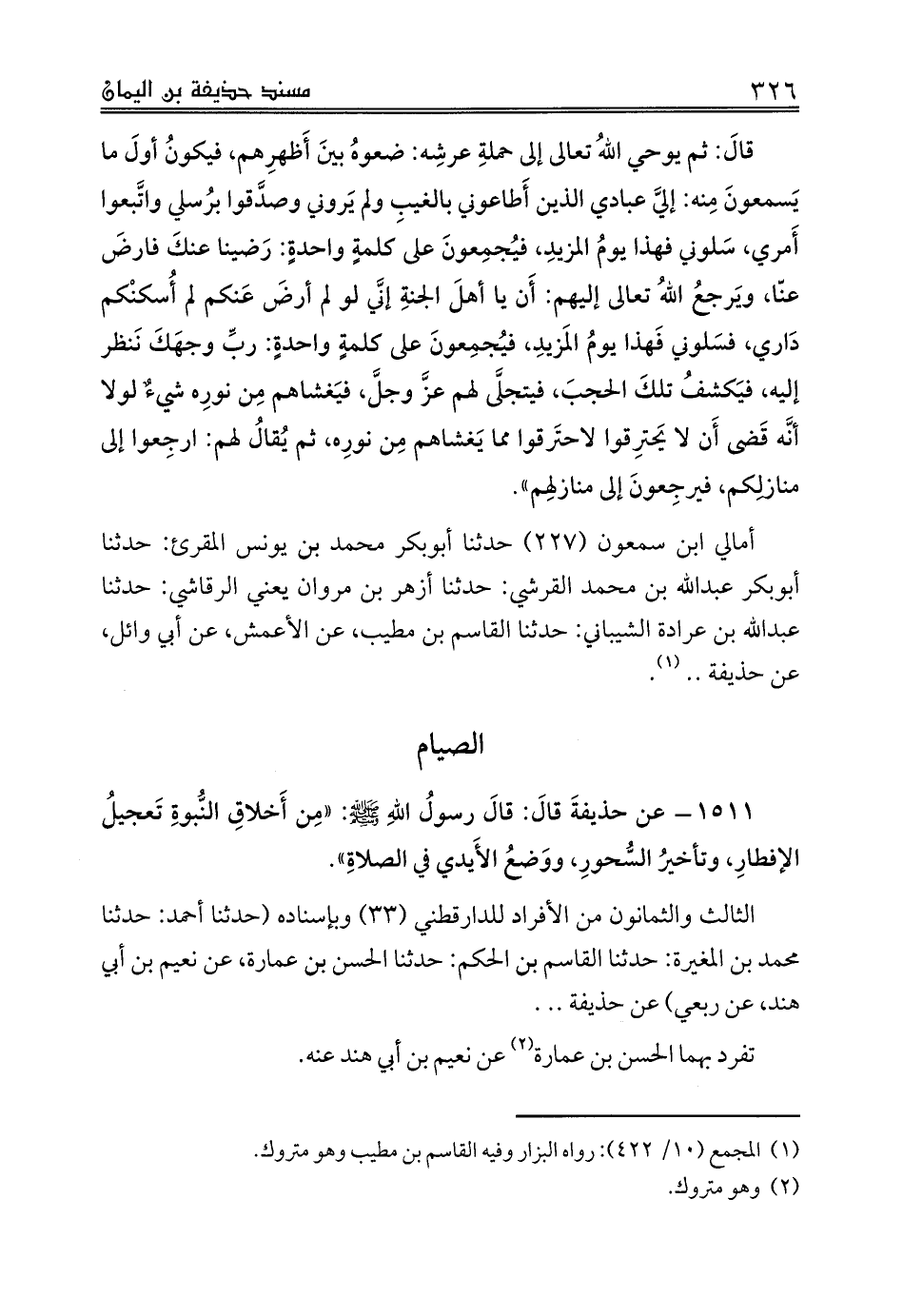 الثالث والثمانون من الأفراد للدارقطني (33) وبإسناده (حدثنا أحمد: حدثنا محمد بن المغيرة: حدثنا القاسم بن الحكم: حدثنا الحسن بن عمارة، عن نعيم بن أبي هند، عن ربعي) عن حذيفة .. .