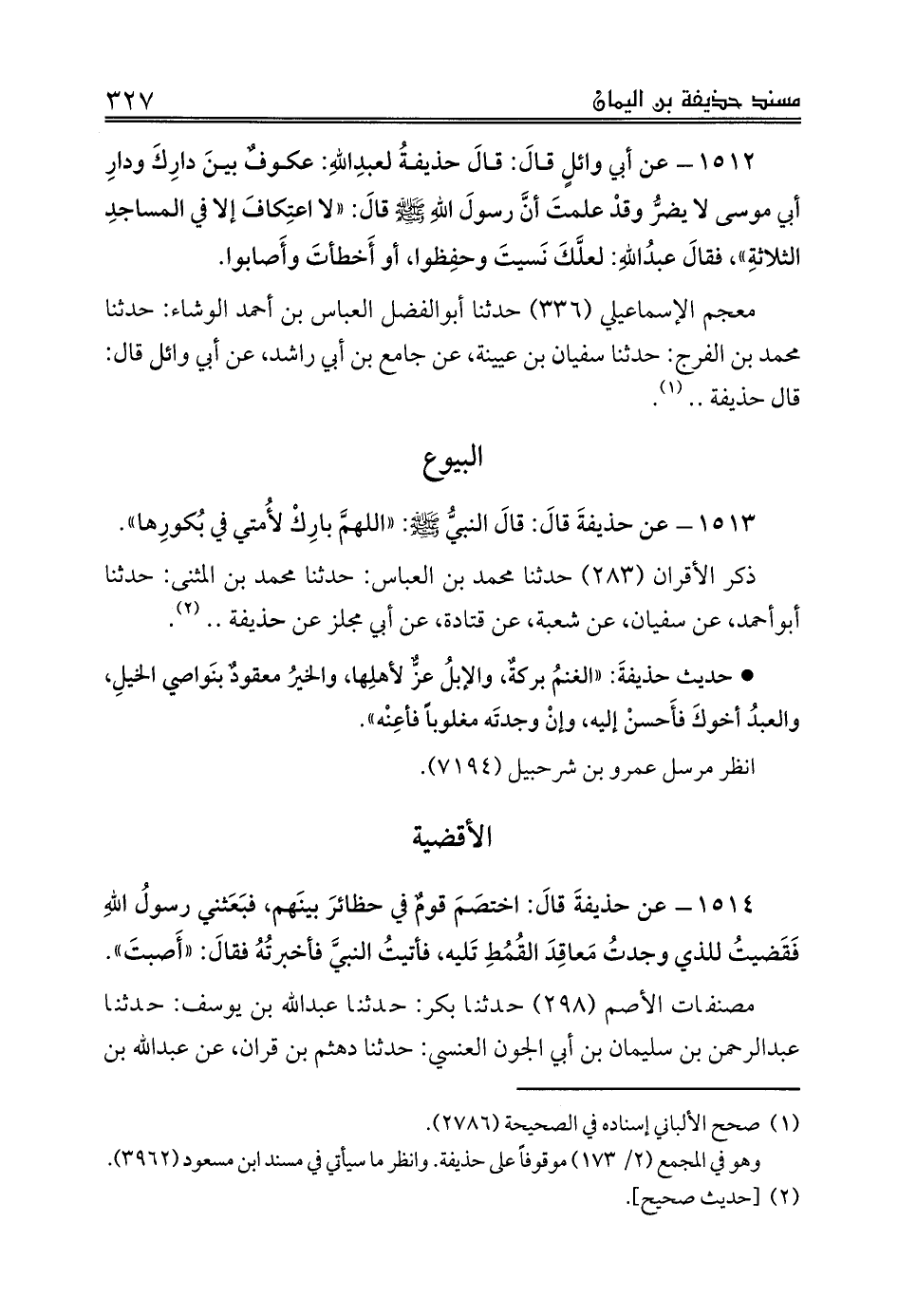 1512 - عن أبي وائلٍ قالَ: قالَ حذيفةُ لعبدِاللهِ: عكوفٌ بينَ دارِكَ ودارِ أبي موسى لا يضرُّ وقدْ علمتَ أنَّ رسولَ اللهِ صلى الله عليه وسلم قالَ: «لا اعتِكافَ إلا في المساجدِ الثلاثةِ»، فقالَ عبدُاللهِ: لعلَّكَ نَسيتَ وحفِظوا، أو أَخطأتَ وأَصابوا.
