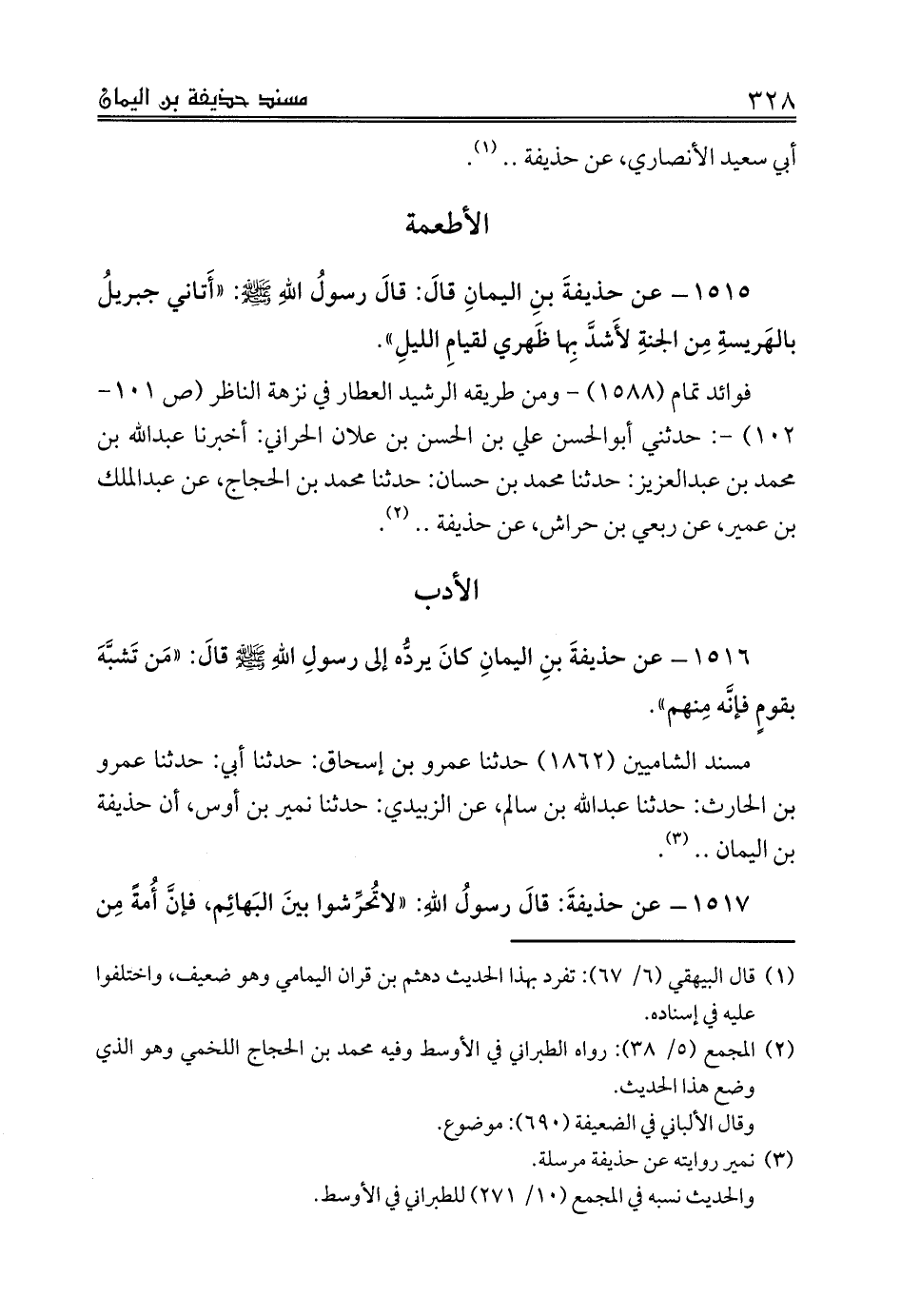 1515 - عن حذيفةَ بنِ اليمانِ، قالَ: قالَ رسولُ اللهِ صلى الله عليه وسلم: «أَتاني جبريلُ بالهَريسةِ مِن الجنةِ لأَشدَّ بِها ظَهري لقيامِ الليلِ».