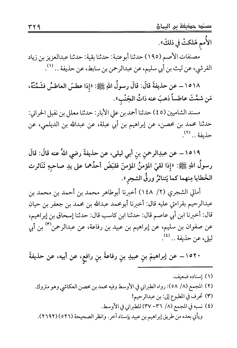 أمالي الشجري (2/ 148) أخبرنا أبوطاهر محمد بن أحمد بن محمد بن عبدالرحيم بقرائي عليه قال: أخبرنا أبومحمد عبدالله بن محمد بن جعفر بن حيان قال: أخبرنا ابن أبي عاصم قال: حدثنا ابن كاسب قال: حدثنا إسحاق بن إبراهيم، عن صفوان بن سليم، عن إبراهيم بن عبيد بن رفاعة، عن عبدالرحمن (¬3) بن أبي ليلى، عن حذيفة .. (¬4).