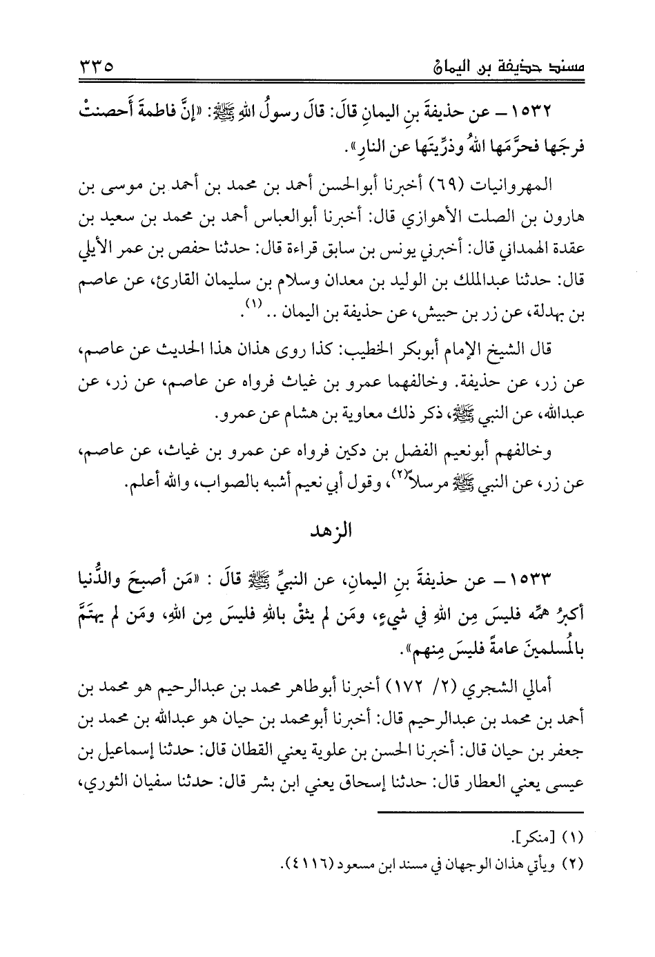 1532 - عن حذيفةَ بنِ اليمانِ قالَ: قالَ رسولُ اللهِ صلى الله عليه وسلم: «إنَّ فاطمةَ أَحصنتْ فرجَها فحرَّمَها اللهُ وذرِّيتَها عن النارِ».