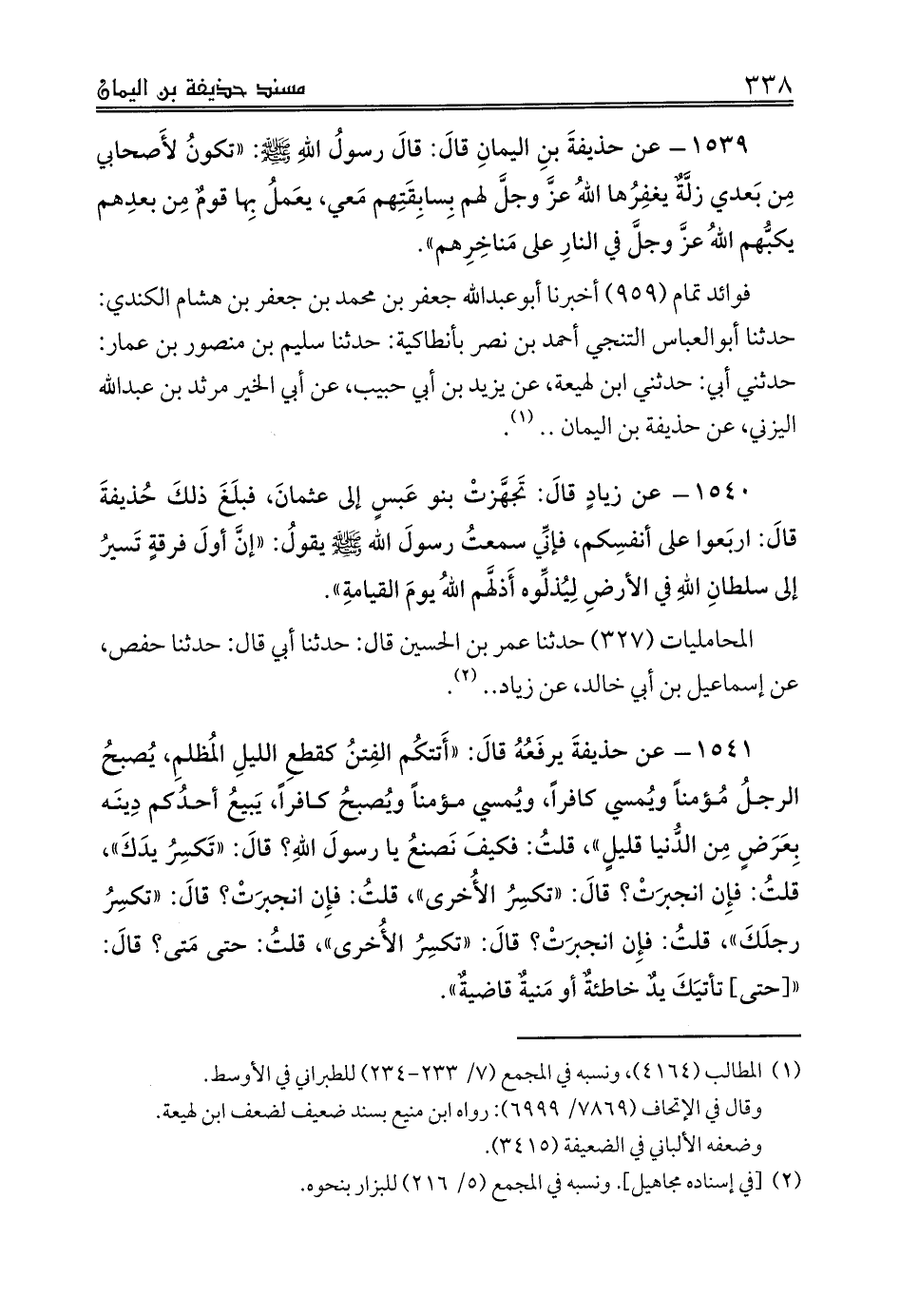 1540 - عن زيادٍ قالَ: تَجهَّزتْ بنو عَبسٍ إلى عثمانَ، فبلَغَ ذلكَ حُذيفةَ قالَ: اربَعوا على أنفسِكم، فإنِّي سمعتُ رسولَ الله صلى الله عليه وسلم يقولُ: «إنَّ أولَ فرقةٍ تَسيرُ إلى سلطانِ اللهِ في الأرضِ لِيُذلِّوه أَذلَّهم اللهُ يومَ القيامةِ».