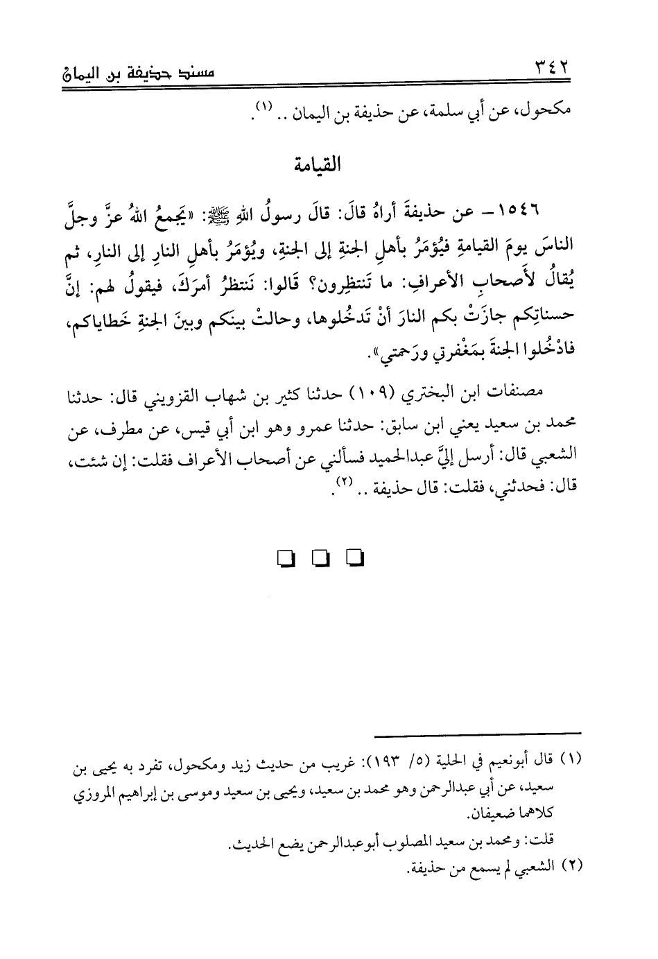 مصنفات ابن البختري (109) حدثنا كثير بن شهاب القزويني قال: حدثنا محمد بن سعيد يعني ابن سابق: حدثنا عمرو وهو ابن أبي قيس، عن مطرف، عن الشعبي قال: أرسل إليَّ عبدالحميد فسألني عن أصحاب الأعراف فقلت: إن شئت، قال: فحدثني، فقلت: قال حذيفة .. (¬2).