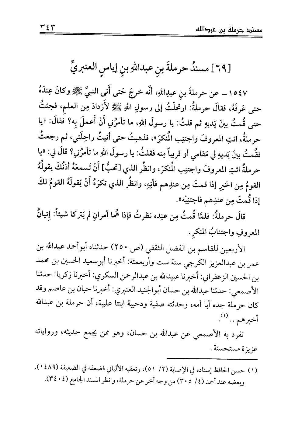 1547 - عن حرملةَ بنِ عبدِاللهِ، أنَّه خرجَ حَتى أَتى النبيَّ صلى الله عليه وسلم وكانَ عِندَهُ حتى عَرفَهُ، فقالَ حرملةُ: ارتحلْتُ إلى رسولِ اللهِ صلى الله عليه وسلم لأَزدادَ مِن العلمِ، فجئتُ حتى قُمتُ بينَ يَديهِ ثم قلتُ: يا رسولَ اللهِ، ما تأمرُني أَنْ أَعملَ بِه؟ فقالَ: «يا حرملةُ، ائتِ المعروفَ واجتنِب المُنكرَ»، فذهبتُ حتى أتيتُ راحِلَتي، ثم رجعتُ فقُمتُ بينَ يَديهِ في مَقامي أو قريباً مِنه فقلتُ: يا رسولَ اللهِ ما تأمرُني؟ قالَ لي: «يا حرملةُ ائتِ المعروفَ واجتنِب المُنكرَ، وانظُر الذي [تحبُّ] أَنْ تَسمعَهُ أذنُكَ يقولُهُ القومُ مِن الخيرِ إذا قمتَ مِن عندِهم فأتِهِ، وانظُر الذي تكرَهُ أَنْ يَقولَهُ القومُ لكَ إذا قُمتَ مِن عندِهم فاجتنِبْه»،