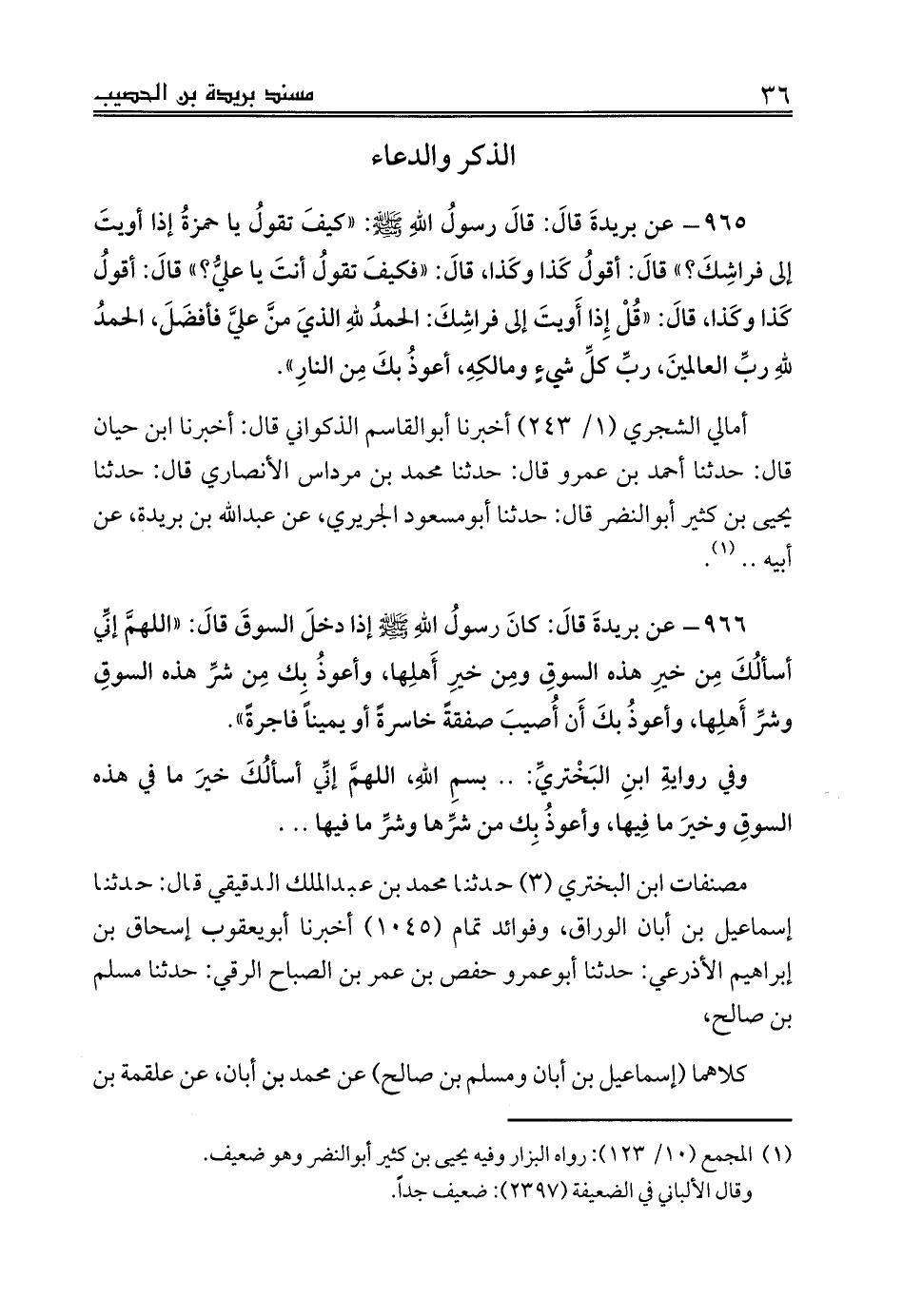 966 - عن بريدةَ قالَ: كانَ رسولُ اللهِ صلى الله عليه وسلم إذا دخلَ السوقَ قالَ: «اللهمَّ إنِّي أسألُكَ مِن خيرِ هذه السوقِ ومِن خيرِ أَهلِها، وأعوذُ بِك مِن شرِّ هذه السوقِ وشرِّ أَهلِها، وأعوذُ بكَ أَن أُصيبَ صفقةً خاسرةً أو يميناً فاجرةً».