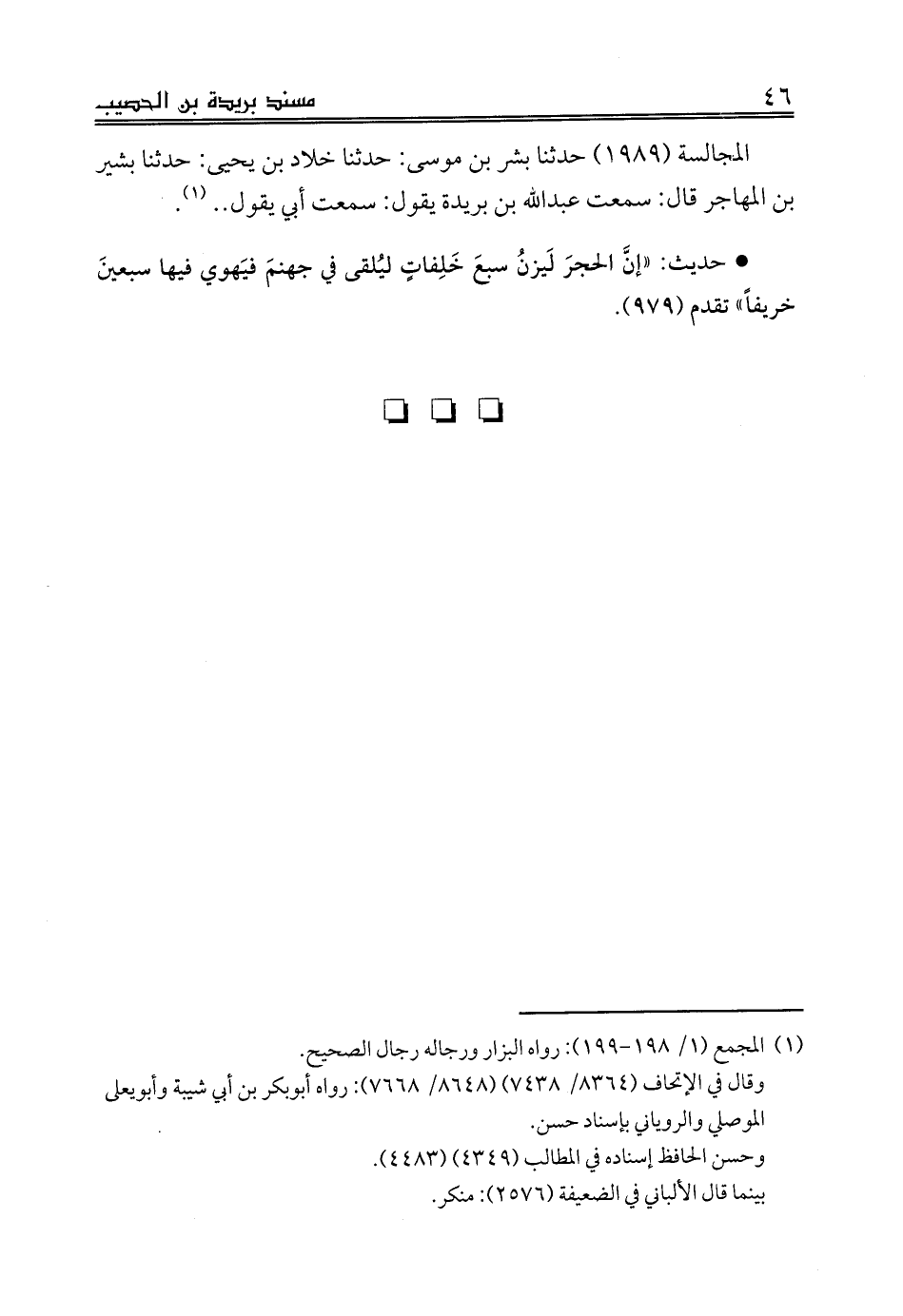 المجالسة (1989) حدثنا بشر بن موسى: حدثنا خلاد بن يحيى: حدثنا بشير بن المهاجر قال: سمعت عبدالله بن بريدة يقول: سمعت أبي يقول .. (¬1).