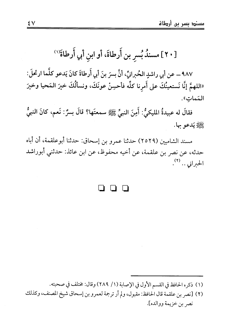 987 - عن أبي راشدٍ الحُبرانيِّ، أنَّ بسرَ بنَ أبي أَرطاةَ كانَ يَدعو كلَّما ارتحلَ: «اللهمَّ إنَّا نَستعينُكَ على أَمرِنا كلِّه فأحسِنْ عونَكَ، ونسألُكَ خيرَ المَحياَ وخيرَ المَماتِ»، فقالَ له عبيدةُ المليكيُّ: أَمِنَ النبيِّ صلى الله عليه وسلم سمعتَها؟ قالَ بسرٌ: نَعم، كانَ النبيُّ صلى الله عليه وسلم يَدعو بها.
