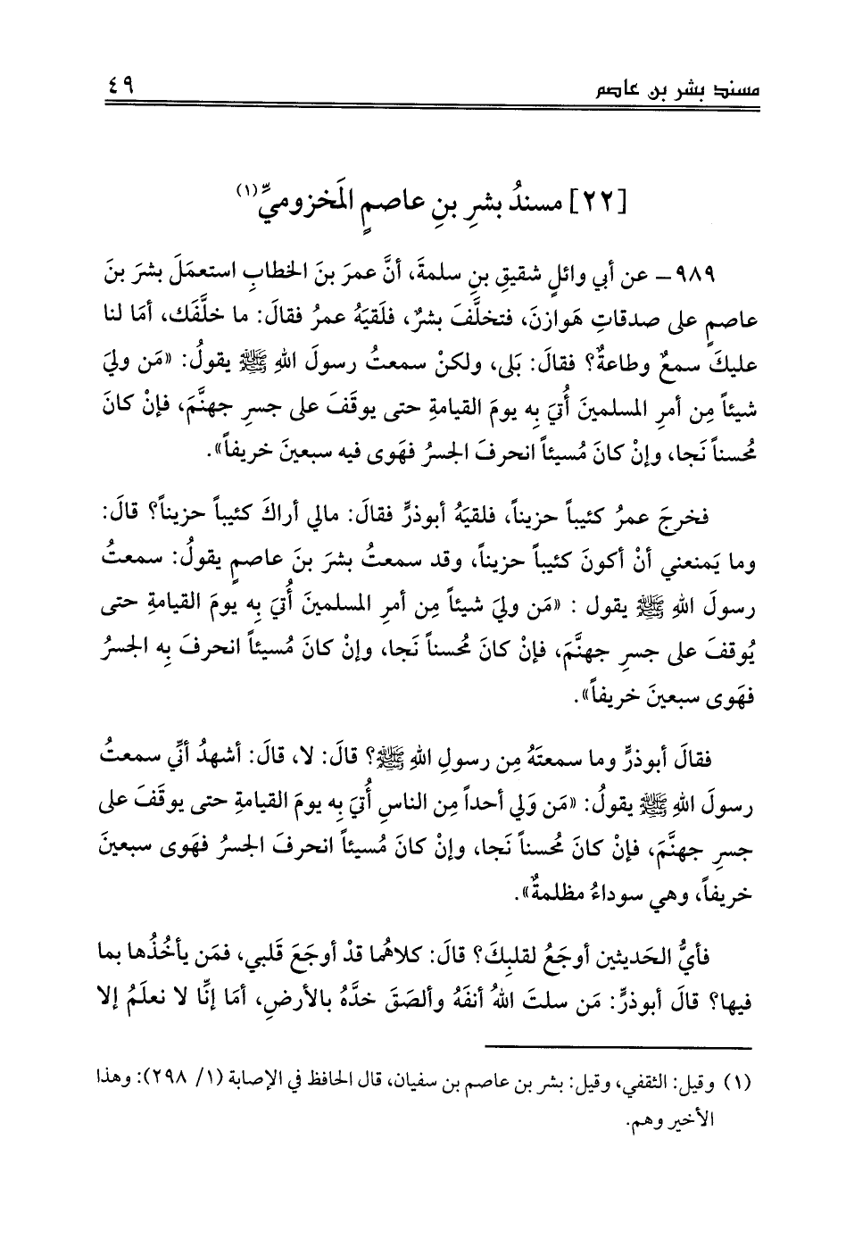 989 - عن أبي وائلٍ شقيقِ بنِ سلمةَ، أنَّ عمرَ بنَ الخطابِ استعمَلَ بشرَ بنَ عاصمٍ على صدقاتِ هَوازنَ، فتخلَّفَ بشرٌ، فلَقيَهُ عمرُ فقالَ: ما خلَّفَك، أمَا لنا عليكَ سمعٌ وطاعةٌ؟ فقالَ: بَلى، ولكنْ سمعتُ رسولَ اللهِ صلى الله عليه وسلم يقولُ: «مَن وليَ شيئاً مِن أمرِ المسلمينَ أُتيَ بِه يومَ القيامةِ حتى يوقَفَ على جسرِ جهنَّمَ، فإنْ كانَ مُحسناً نَجا، وإنْ كانَ مُسيئاً انحرفَ الجسرُ فهَوى فيه سبعينَ خريفاً».