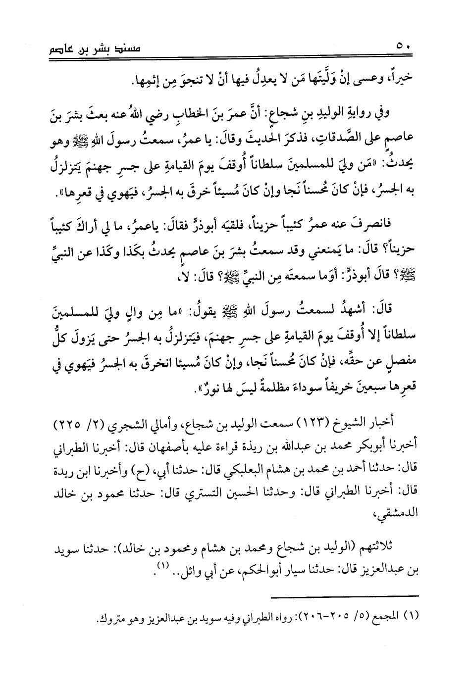 وفي روايةِ الوليدِ بنِ شجاعٍ: أنَّ عمرَ بنَ الخطابِ رضي اللهُ عنه بعثَ بشرَ بنَ عاصمٍ على الصَّدقاتِ، فذكرَ الحديثَ وقالَ: يا عمرُ، سمعتُ رسولَ اللهِ صلى الله عليه وسلم وهو يحدثُ: «مَن وليَ للمسلمينَ سلطاناً أُوقفَ يومَ القيامةِ على جسرِ جهنمَ يَتزلزلُ به الجسرُ، فإنْ كانَ مُحسناً نَجا وإنْ كانَ مُسيئاً خرقَ به الجسرُ، فيَهوي في قعرِها».