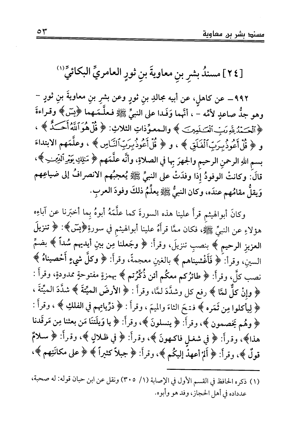 992 - عن كاهلٍ، عن أبيه مجالدِ بنِ ثورٍ وعن بشرِ بنِ معاويةَ بنِ ثورٍ - وهو جدُّ صاعدٍ لأمِّه -، أنَّهما وَفَدا على النبيِّ صلى الله عليه وسلم فعلَّمَهما {يس} وقراءةَ {الْحَمْدُ لِلَّهِ رَبِّ الْعَالَمِينَ} والمعوِّذاتِ الثلاثِ: {قُلْ هُوَ اللَّهُ أَحَدٌ}، و {قُلْ أَعُوذُ بِرَبِّ الْفَلَقِ}، و {قُلْ أَعُوذُ بِرَبِّ النَّاسِ}، وعلَّمَهم الابتداءَ بسمِ اللهِ الرحمنِ الرحيمِ والجهرَ بِها في الصلاةِ، وأنَّه علَّمَهم {مَالِكِ يَوْمِ الدِّينِ}، قالَ: وكانتْ الوفودُ إِذا وفدَتْ على النبيِّ صلى الله عليه وسلم يُعجبُهم الانصرافُ إلى ضياعِهم وَيقلُّ مقامُهم عندَه، وكان النبيُّ صلى الله عليه وسلم يعلِّمُ ذلكَ وفودَ العربِ.
