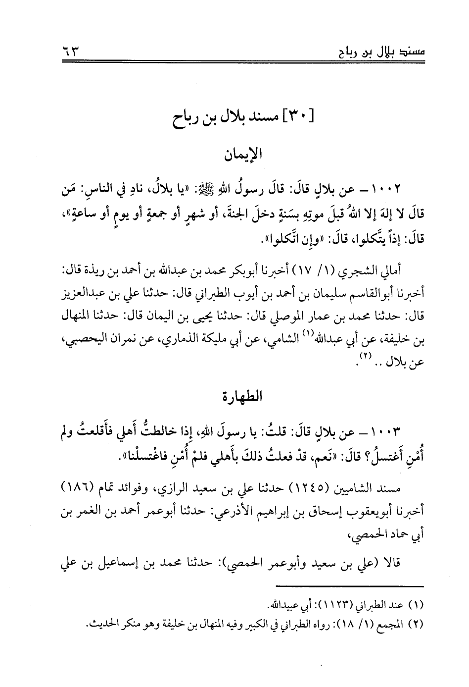 أمالي الشجري (1/ 17) أخبرنا أبوبكر محمد بن عبدالله بن أحمد بن ريذة قال: أخبرنا أبوالقاسم سليمان بن أحمد بن أيوب الطبراني قال: حدثنا علي بن عبدالعزيز قال: حدثنا محمد بن عمار الموصلي قال: حدثنا يحيى بن اليمان قال: حدثنا المنهال بن خليفة، عن أبي عبدالله (¬1) الشامي، عن أبي مليكة الذماري، عن نمران اليحصبي، عن بلال .. (¬2).