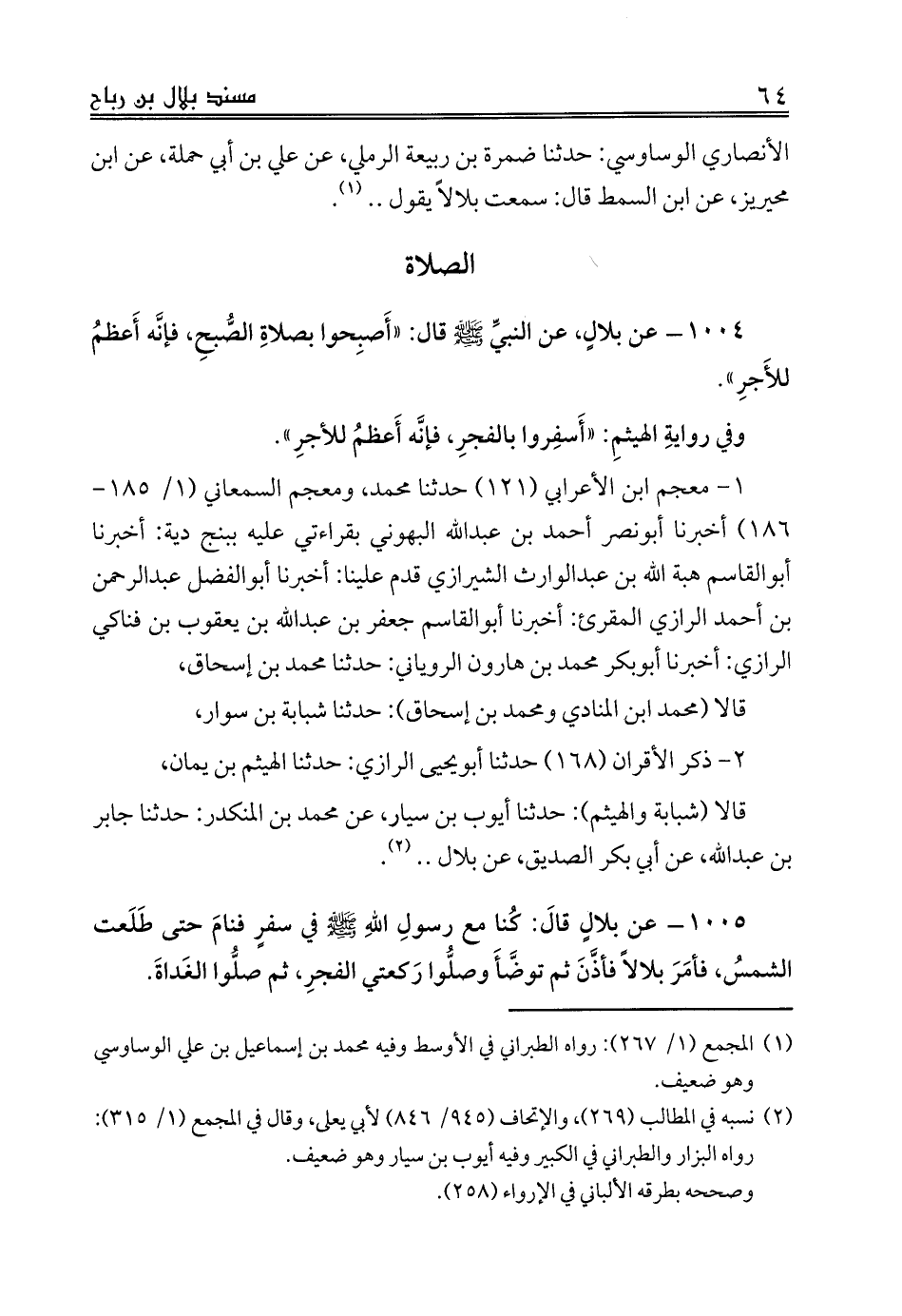 1004 - عن بلالٍ، عن النبيِّ صلى الله عليه وسلم قال: «أَصبِحوا بصلاةِ الصُّبحِ، فإنَّه أَعظمُ للأَجرِ».