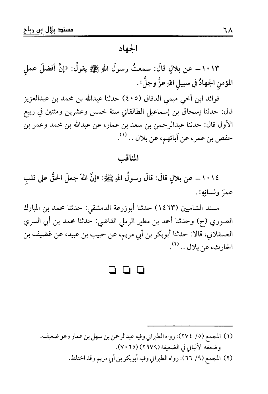 1013 - عن بلالٍ قالَ: سمعتُ رسولَ اللهِ صلى الله عليه وسلم يقولُ: «إنَّ أفضلَ عملِ المؤمنِ الجهادُ في سبيلِ اللهِ عزَّ وجلَّ».