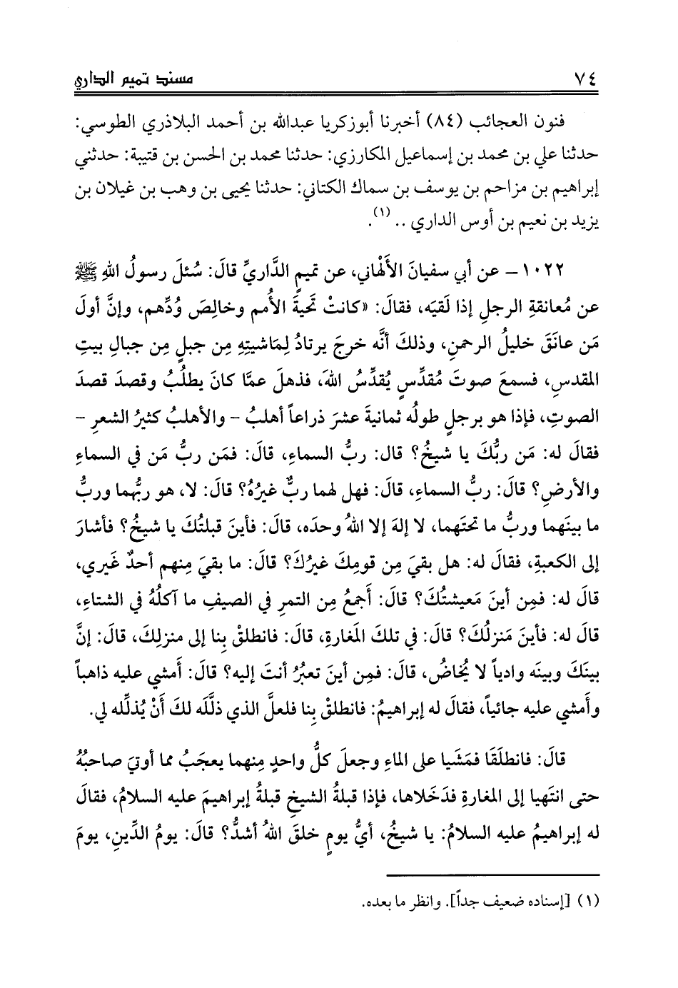 1022 - عن أبي سفيانَ الأَلْهاني، عن تميمٍ الدَّاريِّ قالَ: سُئلَ رسولُ اللهِ صلى الله عليه وسلم عن مُعانقةِ الرجلِ إذا لَقيَه، فقالَ: «كانتْ تَحيةَ الأُمم وخالِصَ وُدِّهم، وإنَّ أولَ مَن عانَقَ خليلُ الرحمنِ، وذلكَ أنَّه خرجَ يرتادُ لِمَاشيتِهِ مِن جبلٍ مِن جبالِ بيتِ المقدسِ، فسمعَ صوتَ مُقدِّسٍ يُقدِّسُ اللهَ، فذهلَ عمَّا كانَ يطلُبُ وقصدَ قصدَ الصوتِ، فإذا هو برجلٍ طولُه ثمانيةَ عشرَ ذراعاً أهلبُ - والأهلبُ كثيرُ الشعرِ - فقالَ له: مَن ربُّكَ يا شيخُ؟ قال: ربُّ السماءِ، قالَ: فمَن ربُّ مَن في السماءِ والأرضِ؟ قالَ: ربُّ السماءِ، قالَ: فهل لهما ربٌّ غيرُهُ؟ قالَ: لا، هو ربُّهما وربُّ ما بينَهما وربُّ ما تحتَهما، لا إلهَ إلا اللهُ وحدَه، قالَ: فأينَ قبلتُكَ يا شيخُ؟ فأشارَ إلى الكعبةِ، فقالَ له: هل بقيَ مِن قومِكَ غيرُكَ؟ قالَ: ما بقيَ مِنهم أحدٌ غَيري، قالَ له: فمِن أينَ مَعيشتُكَ؟ قالَ: أَجمعُ مِن التمرِ في الصيفِ ما آكلُهُ في الشتاءِ، قالَ له: فأينَ مَنزلُكَ؟ قالَ: في تلكَ المَغارةِ، قالَ: فانطلقْ بِنا إلى منزلِكَ، قالَ: إنَّ بينَكَ وبينَه وادياً لا يُخاضُ، قالَ: فمِن أينَ تعبُرُ أنتَ إليه؟ قالَ: أَمشي عليه ذاهباً وأَمشي عليه جائياً، فقالَ له إبراهيمُ: فانطلقْ بِنا فلعلَّ الذي ذلَّلَه لكَ أَنْ يُذلِّله لي.