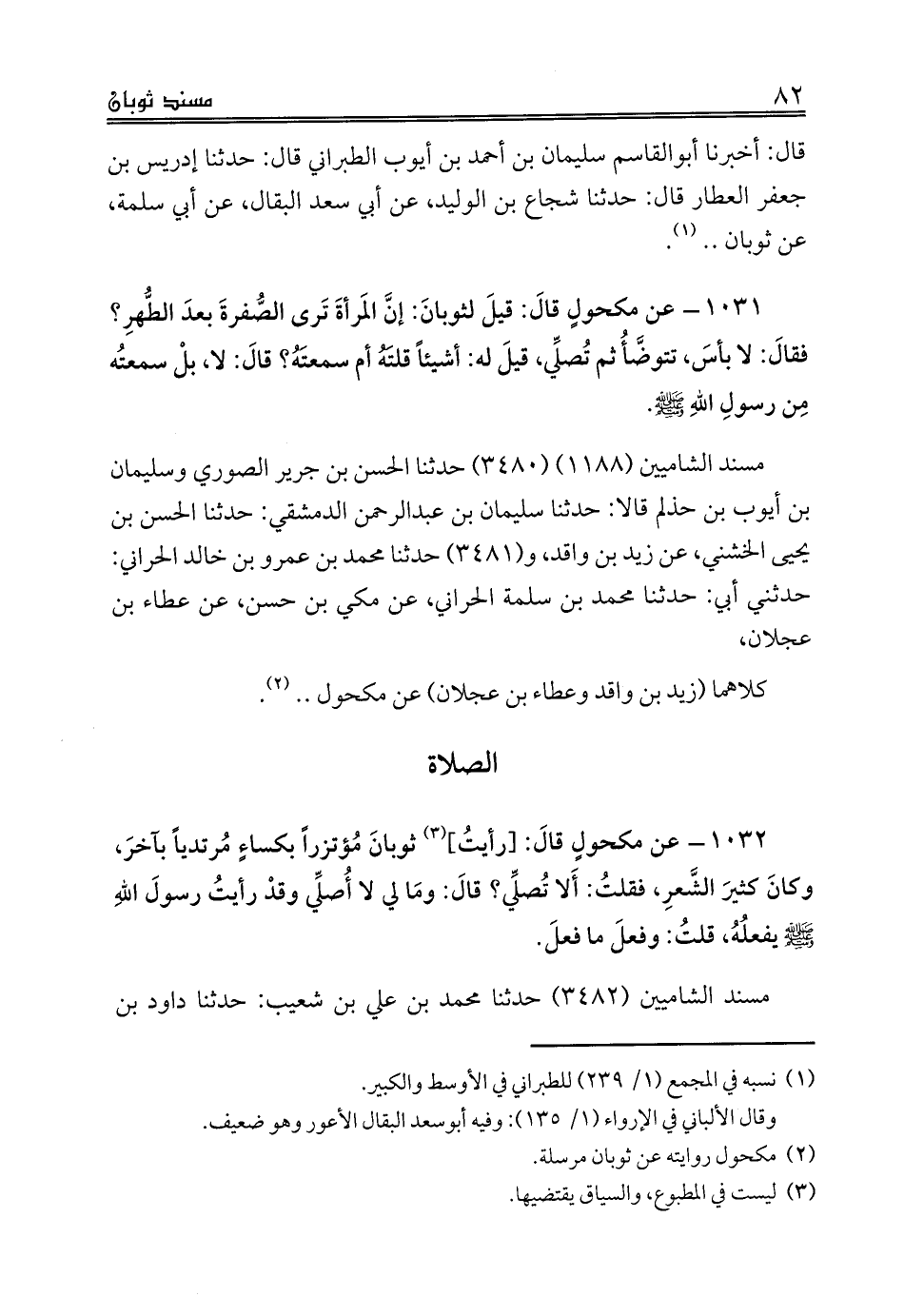 1032 - عن مكحولٍ قالَ: [رأيتُ] (¬3) ثوبانَ مُؤتزراً بكساءٍ مُرتدياً بآخرَ، وكانَ كثيرَ الشَّعرِ، فقلتُ: أَلا تُصلِّي؟ قالَ: ومَا لي لا أُصلِّي وقدْ رأيتُ رسولَ اللهِ صلى الله عليه وسلم يفعلُهُ، قلتُ: وفعلَ ما فعلَ.