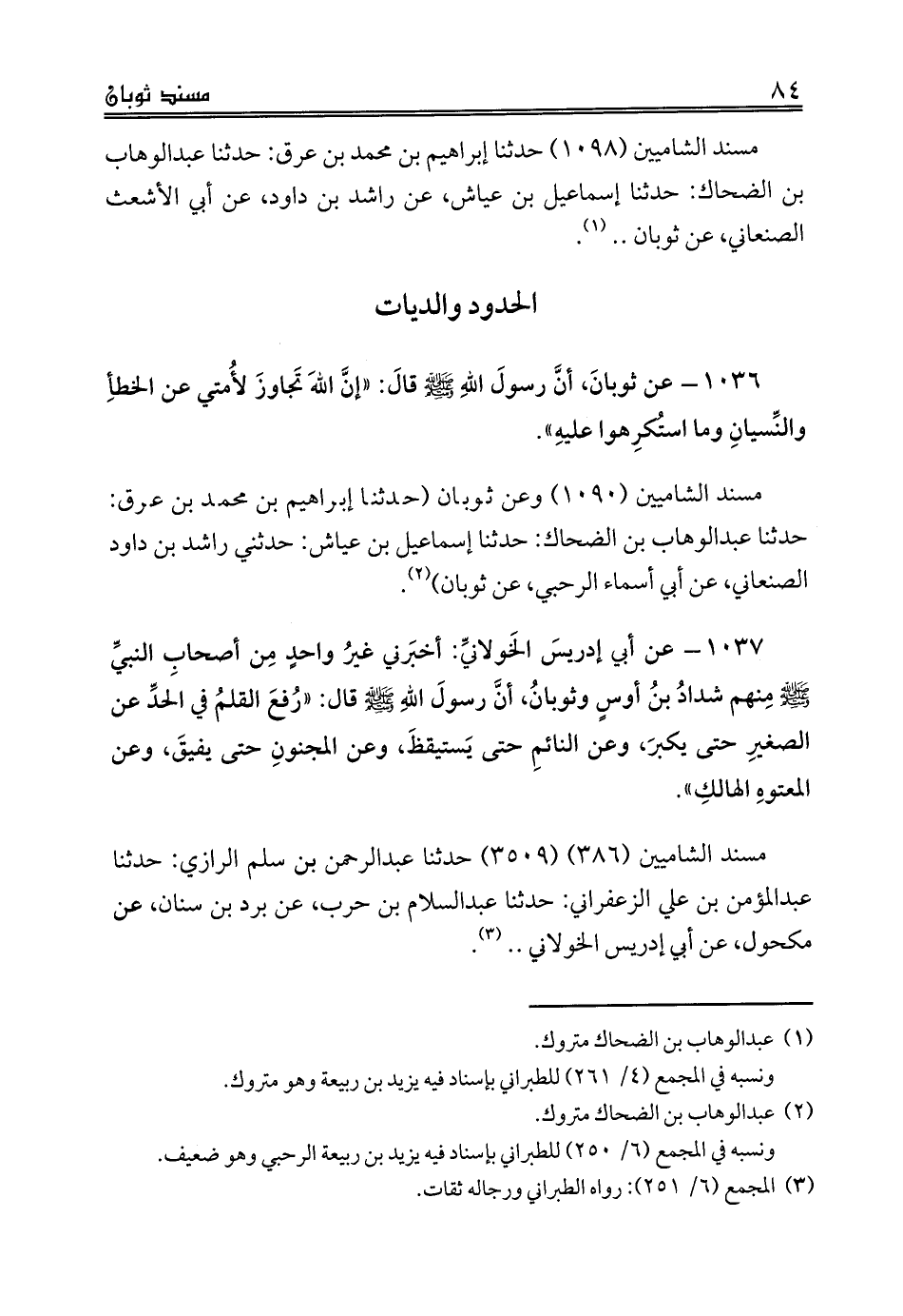 مسند الشاميين (1090) وعن ثوبان (حدثنا إبراهيم بن محمد بن عرق: حدثنا عبدالوهاب بن الضحاك: حدثنا إسماعيل بن عياش: حدثني راشد بن داود الصنعاني، عن أبي أسماء الرحبي، عن ثوبان) (¬2).