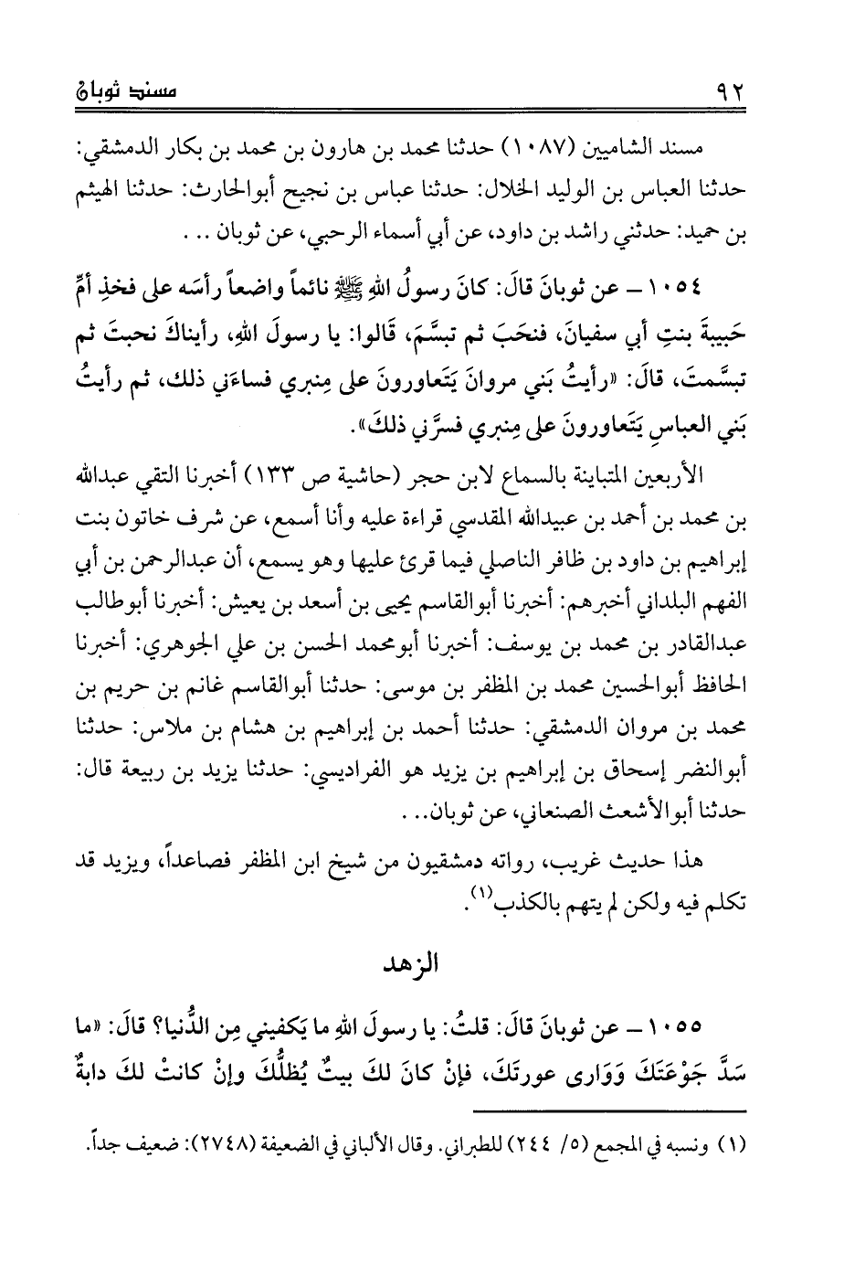 1054 - عن ثوبانَ قالَ: كانَ رسولُ اللهِ صلى الله عليه وسلم نائماً واضعاً رأسَه على فخذِ أمِّ حَبيبةَ بنتِ أبي سفيانَ، فنحَبَ ثم تبسَّمَ، قَالوا: يا رسولَ اللهِ، رأيناكَ نحبتَ ثم تبسَّمتَ، قالَ: «رأيتُ بَني مروانَ يَتَعاورونَ على مِنبري فساءَني ذلك، ثم رأيتُ بَني العباسِ يَتَعاورونَ على مِنبري فسرَّني ذلكَ».