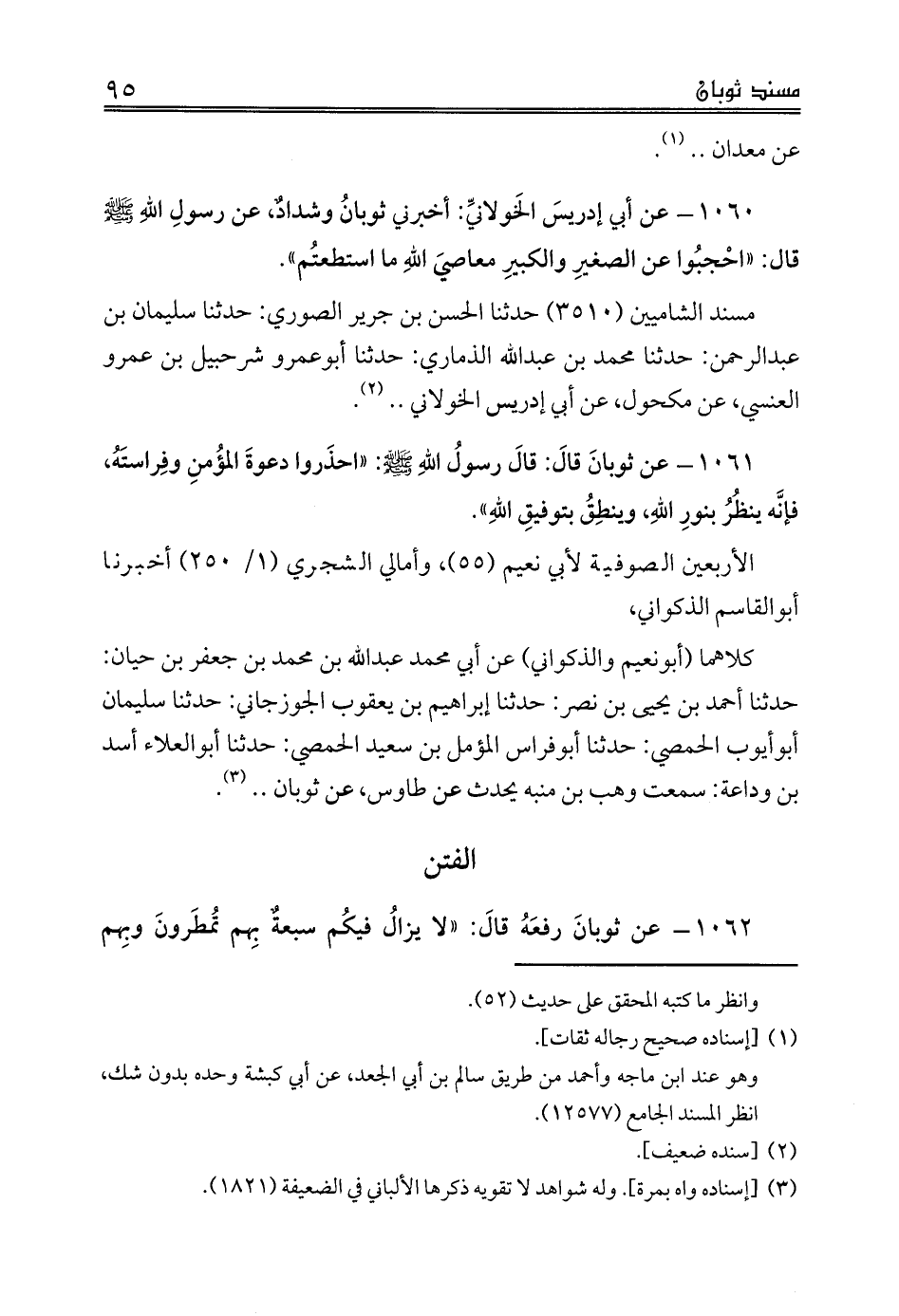 كلاهما (أبونعيم والذكواني) عن أبي محمد عبدالله بن محمد بن جعفر بن حيان: حدثنا أحمد بن يحيى بن نصر: حدثنا إبراهيم بن يعقوب الجوزجاني: حدثنا سليمان أبوأيوب الحمصي: حدثنا أبوفراس المؤمل بن سعيد الحمصي: حدثنا أبوالعلاء أسد بن وداعة: سمعت وهب بن منبه يحدث عن طاوس، عن ثوبان .. (¬3).