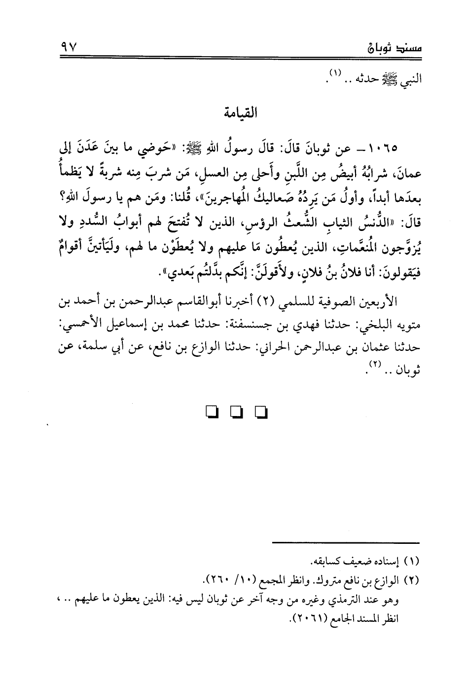 1065 - عن ثوبانَ قالَ: قالَ رسولُ اللهِ صلى الله عليه وسلم: «حَوضي ما بينَ عَدَنَ إلى عمانَ، شرابُهُ أبيضُ مِن اللَّبنِ وأَحلى مِن العسلِ، مَن شربَ مِنه شربةً لا يَظمأُ بعدَها أبداً، وأولُ مَن يَرِدُهُ صَعاليكُ المُهاجرينَ»، قُلنا: ومَن هم يا رسولَ اللهِ؟ قالَ: «الدُّنسُ الثيابِ الشُّعثُ الرؤسِ، الذين لا تُفتحَ لهم أبوابُ السُّددِ ولا يُزوَّجون المُنَّعماتِ، الذين يُعطُون مَا عليهم ولا يُعطَوْن ما لهم، ولَيَأتينَّ أقوامٌ فيَقولونَ: أنا فلانُ بنُ فلانٍ، ولأَقولَنَّ: إنَّكم بدَّلتُم بَعدي».